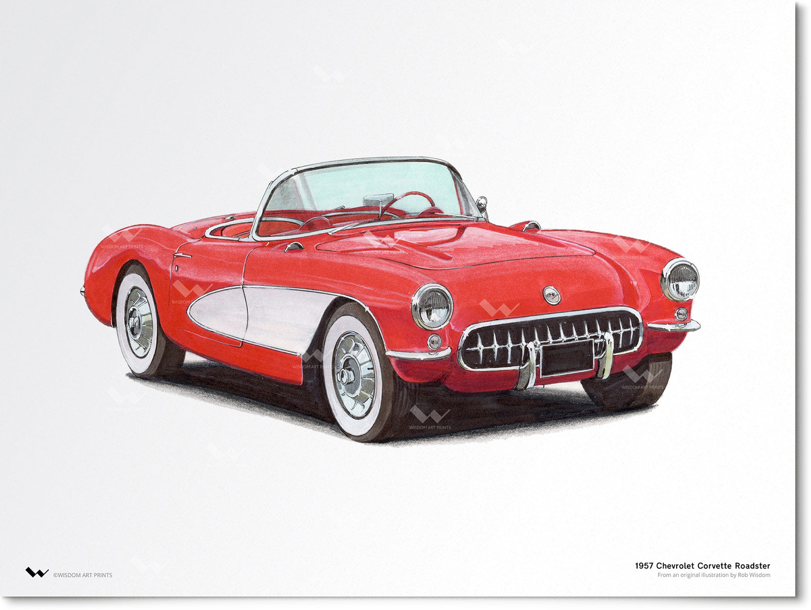 The Chevrolet Corvette - or Vette - is one of the most iconic sports cars in automotive history, in production from 1953 to the present day. The first generation Corvette - sometimes referred to as the C1 - ran until 1962. This illustration depicts a 1957 Corvette 2-door roadster - a model visually unchanged from the 1956 Corvette - which boasted a 4.6 L engine and was designed with performance motorsport and racing in mind.