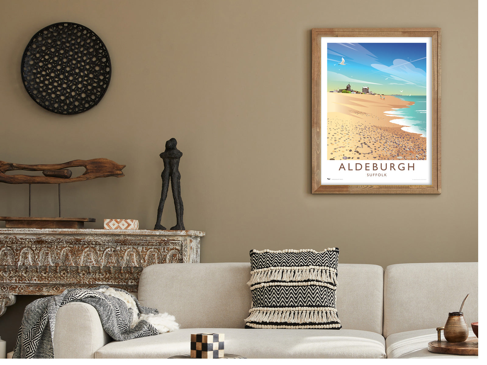This Suffolk illustration by artist Rob Wisdom is a high-quality Giclée travel poster on cotton-rich fine art paper. For our classic Aldeburgh art print, click here.