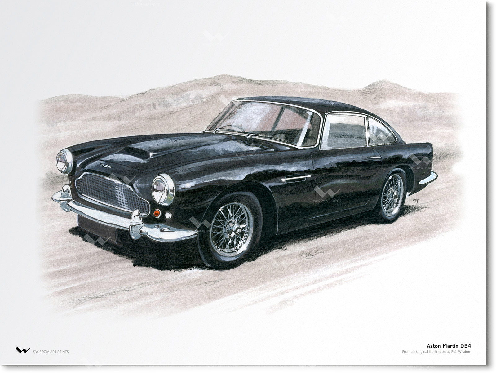 The Aston Martin DB4 is a classic sports car that was produced by Aston Martin from 1958 to 1963, replacing the earlier DB 2/4 Mark III. Featuring a lightweight 'superleggera' tube-frame body and a DOHC Straight Six engine, the DB4 had market-leading acceleration, and put Aston Martin back into competition with the likes of Ferrari and Maserati. This illustration depicts a DB4 2-door coupé.