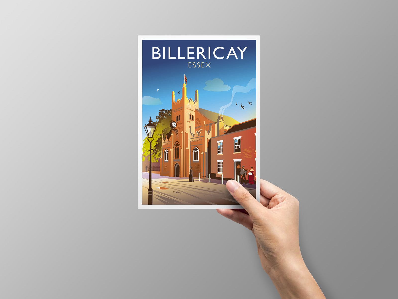 This Essex illustration by artist Rob Wisdom is a high-quality A5 greeting card. For our Giclée art print of Billericay, click here.