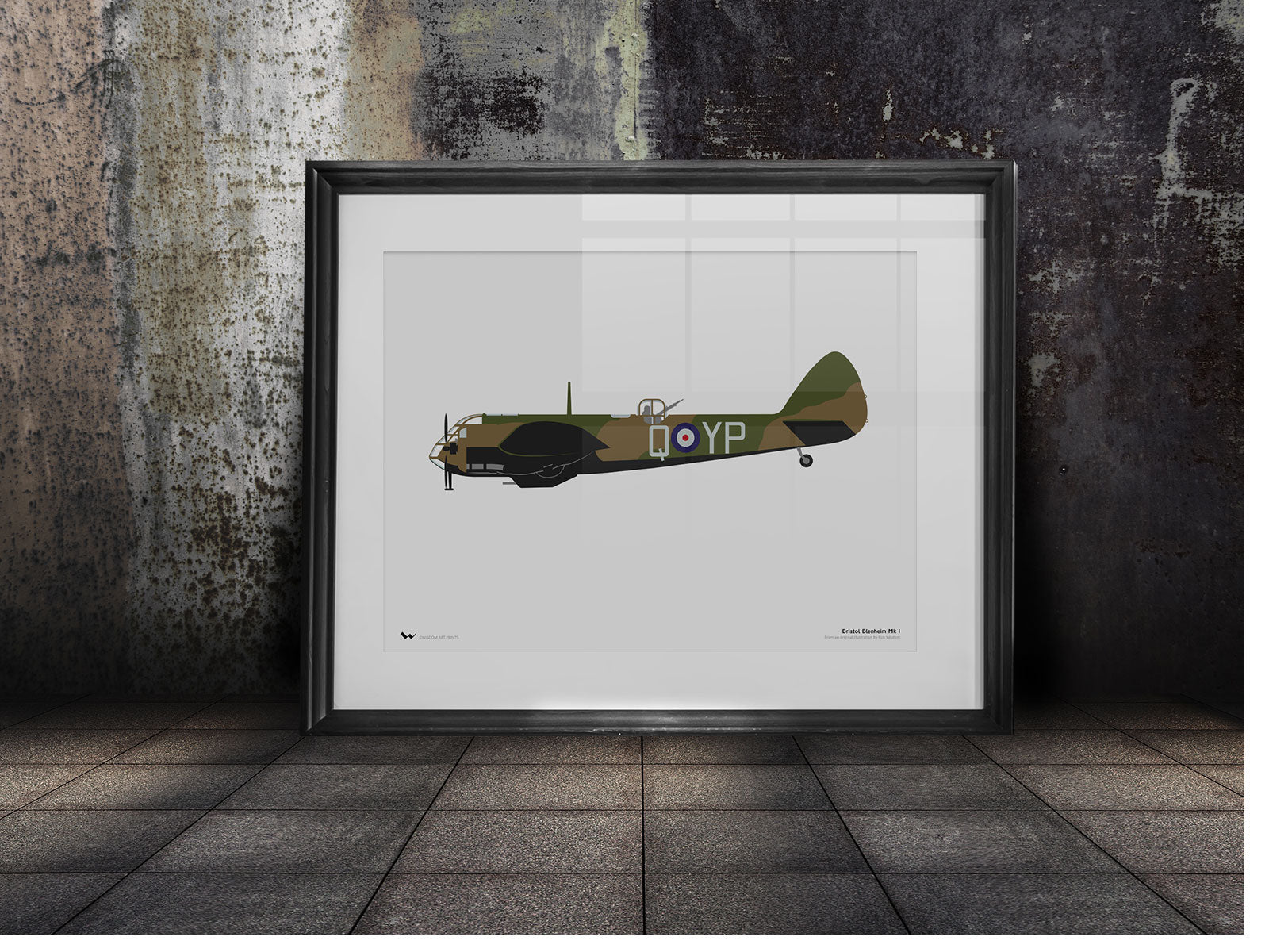 High quality art print of a Bristol Blenheim, a British light bomber aircraft which is known for its role in the Second World War. 4,422 Blenheims were manufactured from 1935 to 1943, when it was phased out in favour of more modern aircraft.