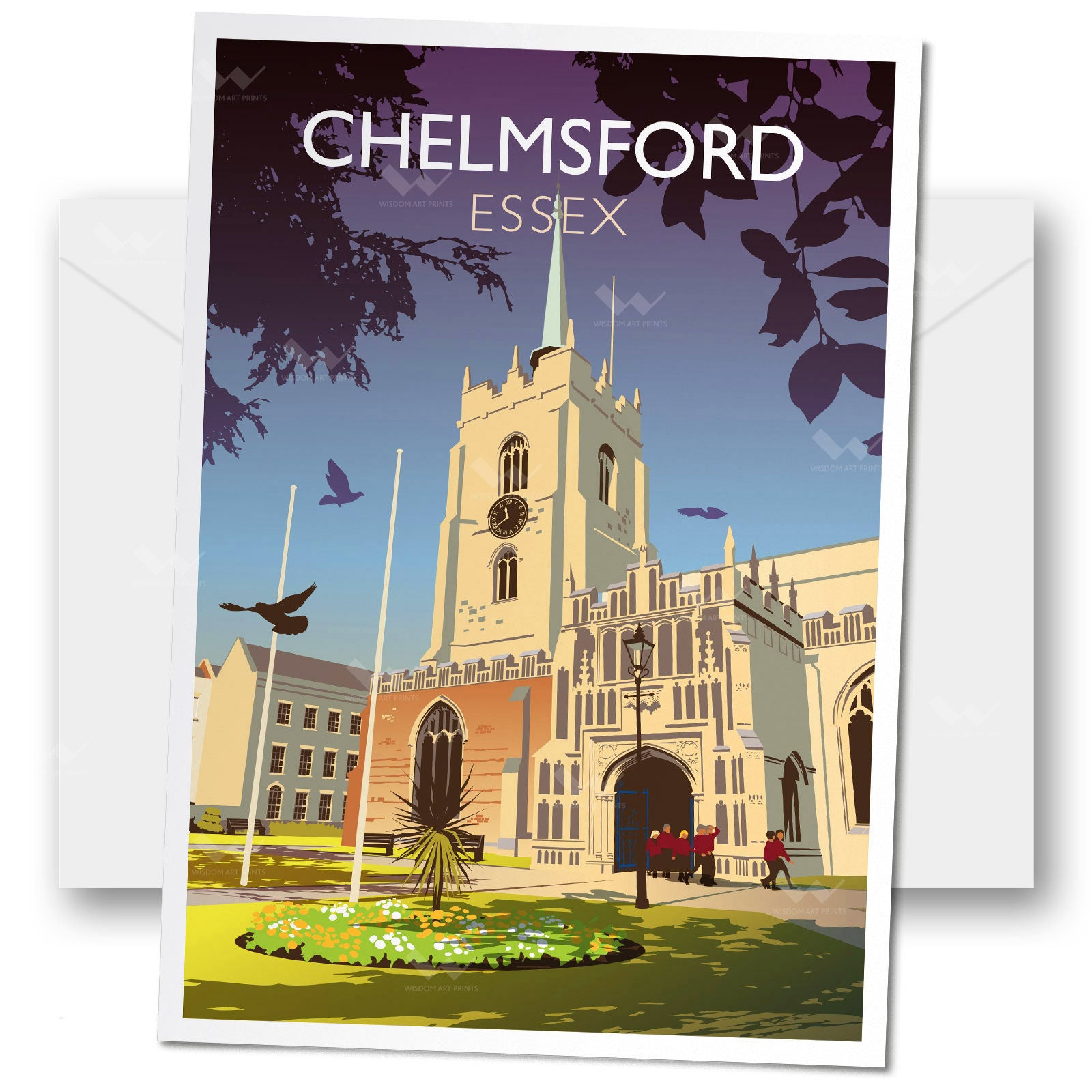 High quality greeting card of Chelmsford, the county town of Essex. Chelmsford is the seat of the Diocese of Chelmsford, the Church of England's second-largest diocese, which covers Essex and parts of outer London which were traditionally parts of Essex. Chelmsford itself is a flourishing modern city with a history that stretches back to the Roman period.
