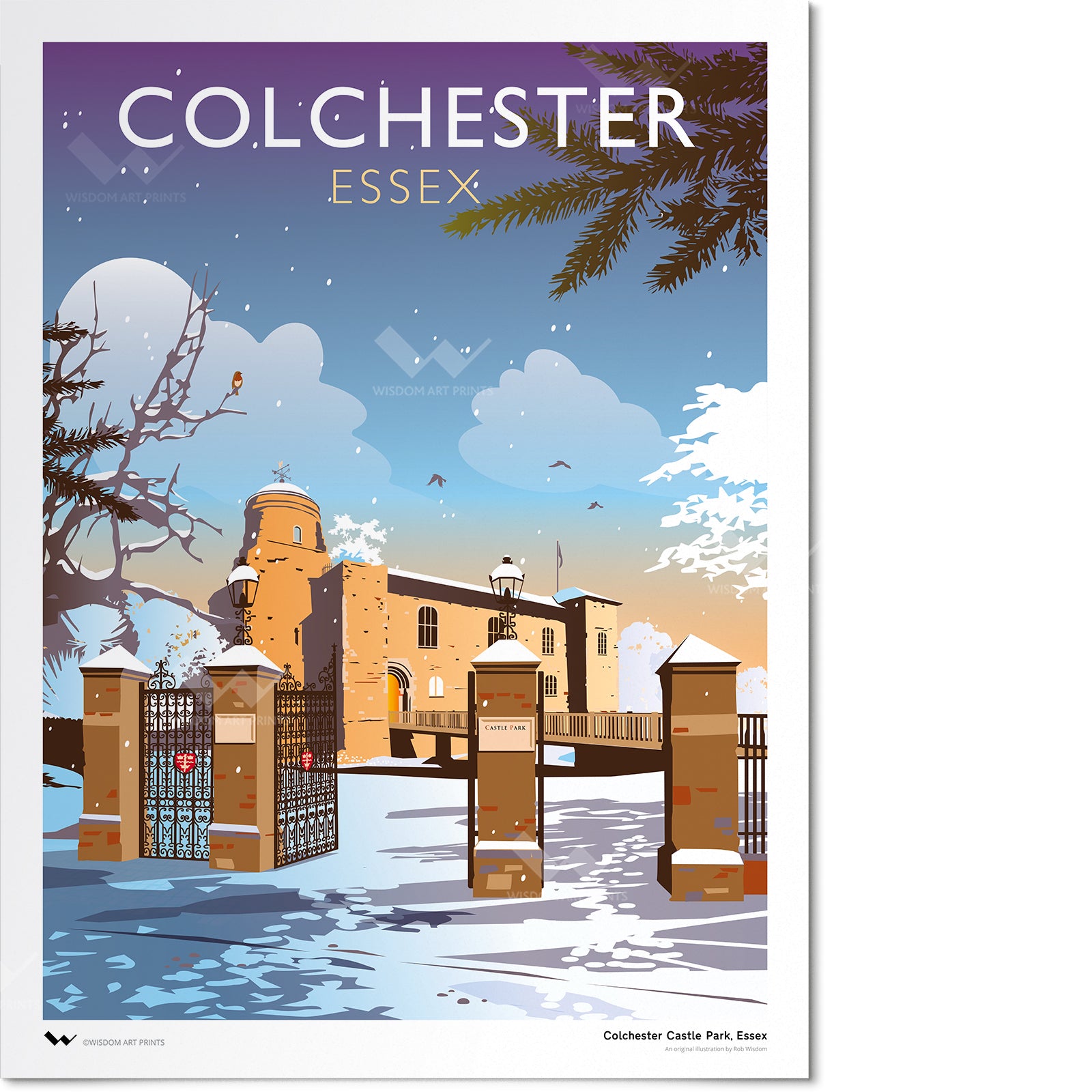High quality Christmas art print of Colchester Castle, an 11th century Norman castle in Colchester, Essex. Located in the centre of Colchester, the castle boasts an impressive museum, and is at the heart of Castle Park, a Grade II listed Victorian park.