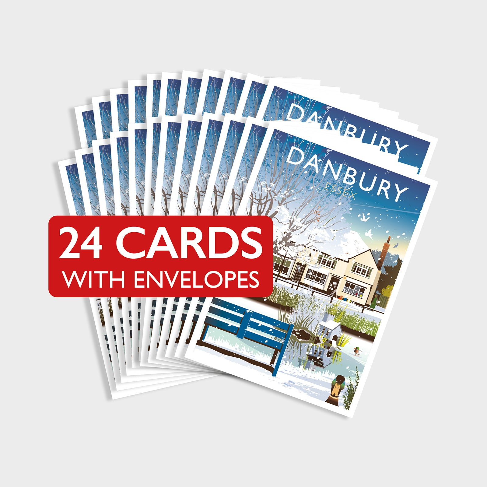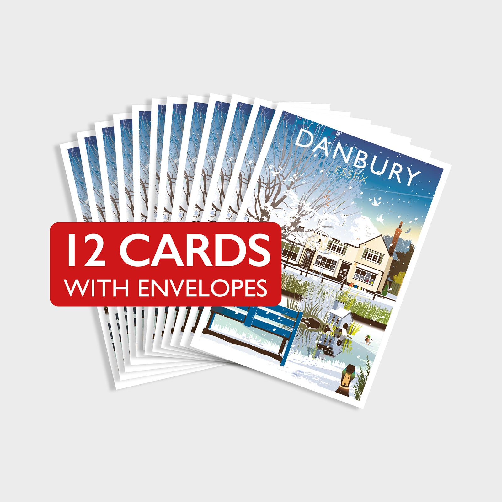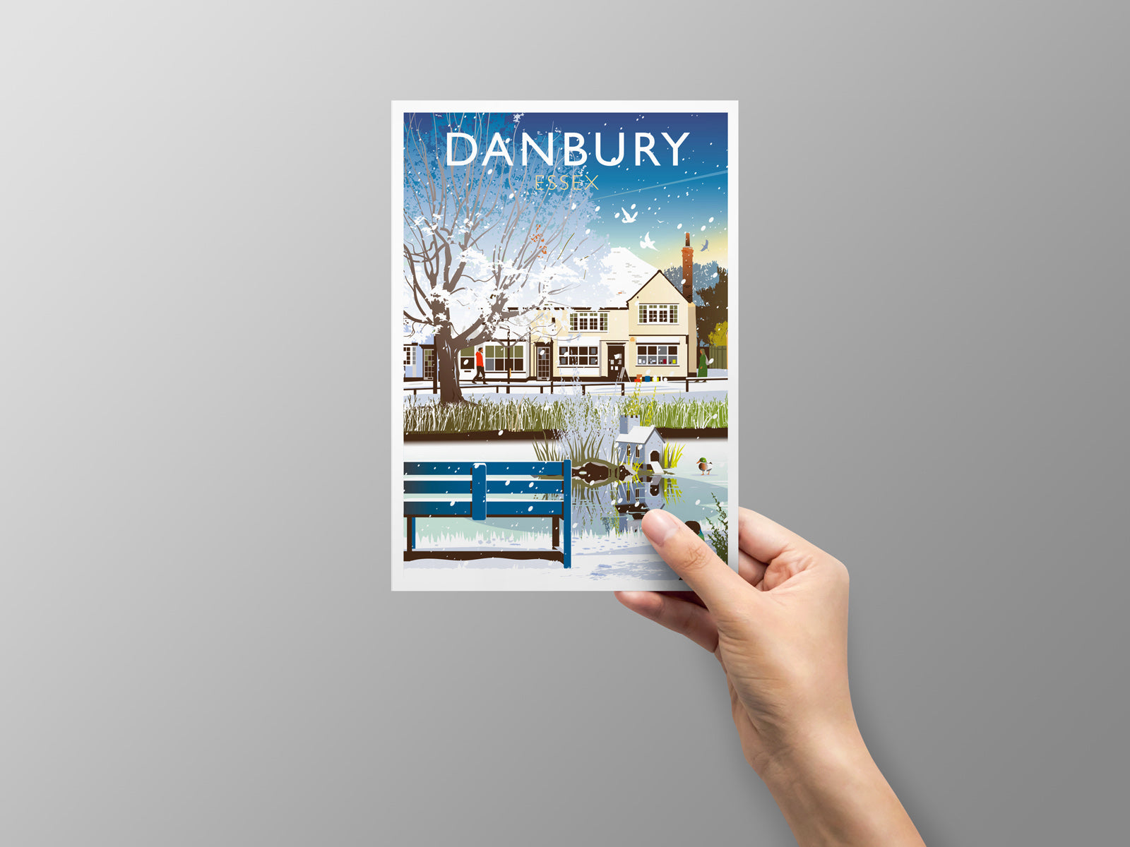 High quality Christmas card of the village of Danbury, located between Chelmsford and Maldon in Essex. Danbury's history stretches back as far as the Iron Age, though the oldest surviving building is the 13th century Church of St. John the Baptist, now a grade I listed building. Local legend has it that the devil once attempted to destroy the church, and stole one of its six bells; to this day, the church has only five bells. However, the bell proved too heavy to carry, and the devil dropped it not far from the church - the spot is marked today by local pub The Bell.