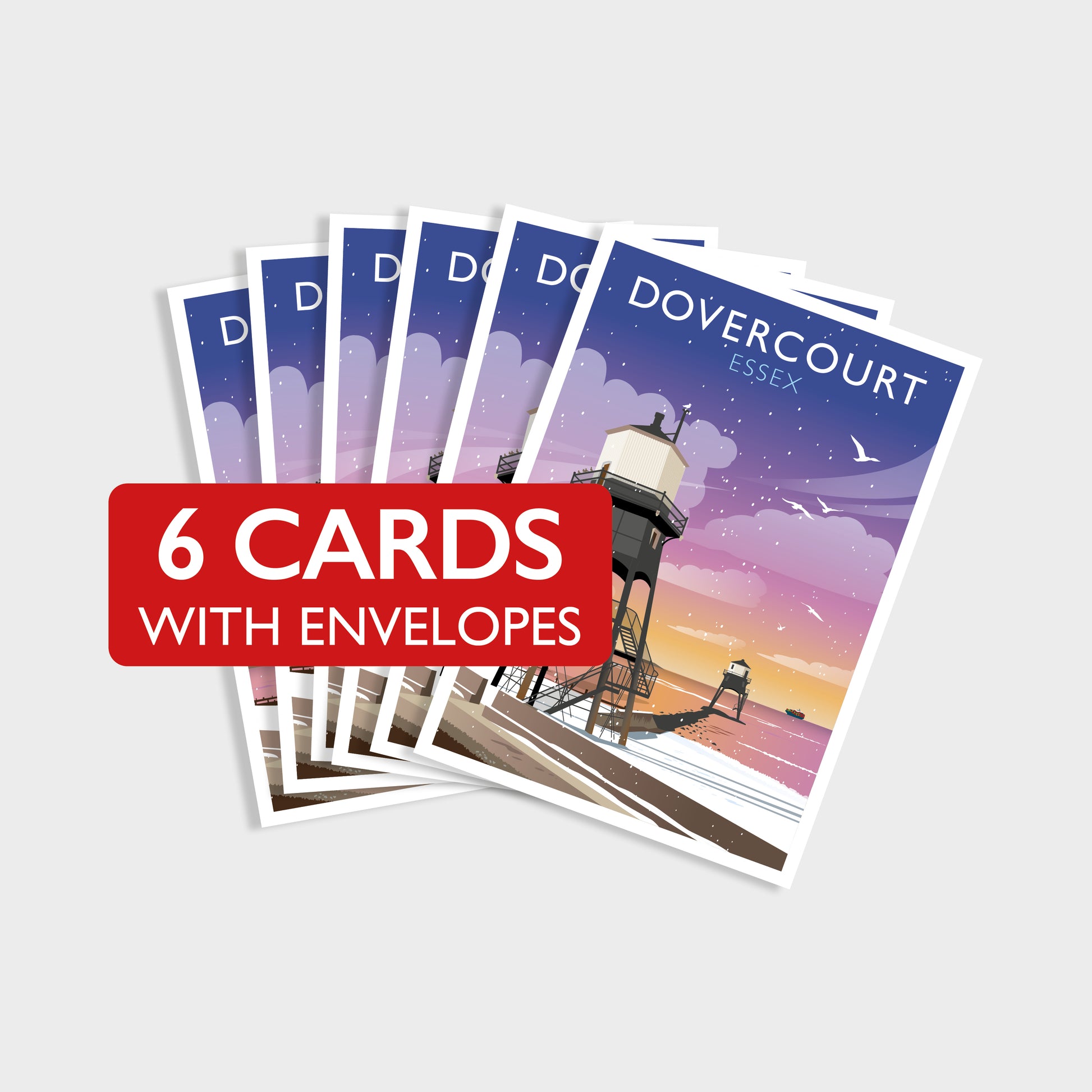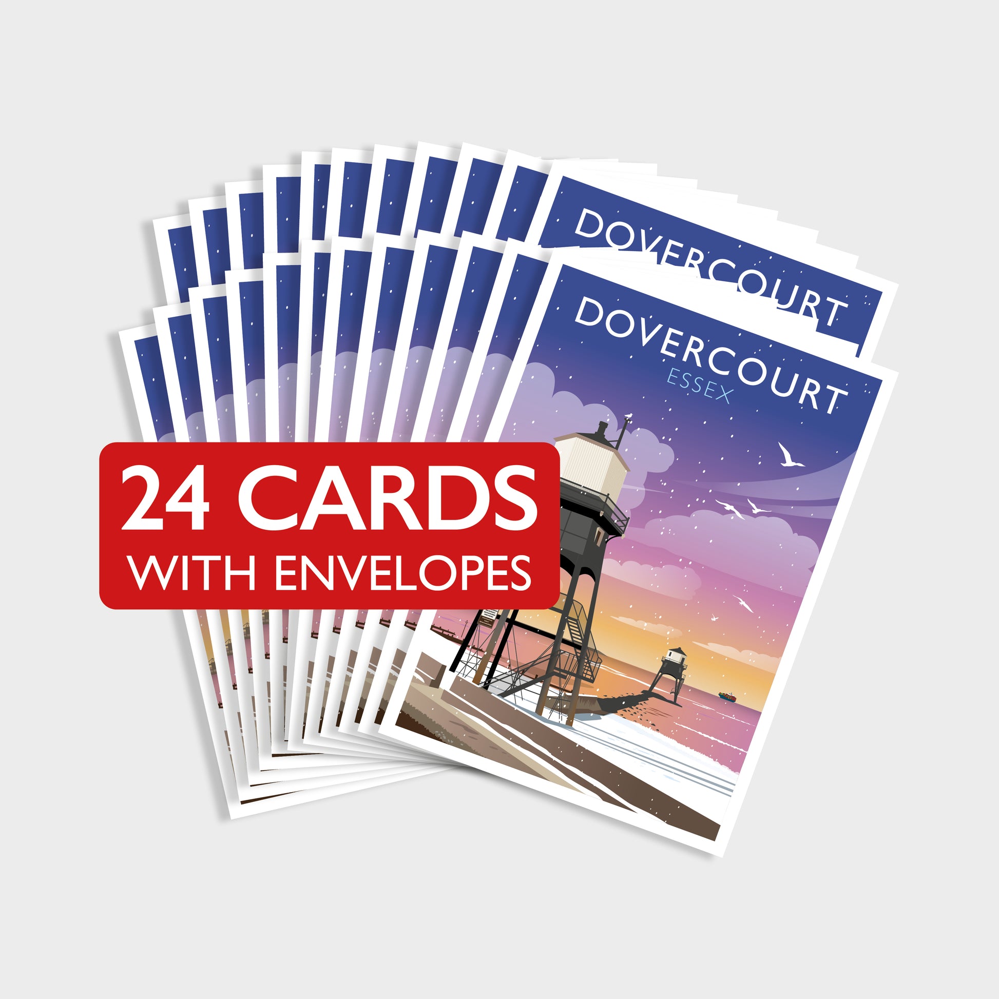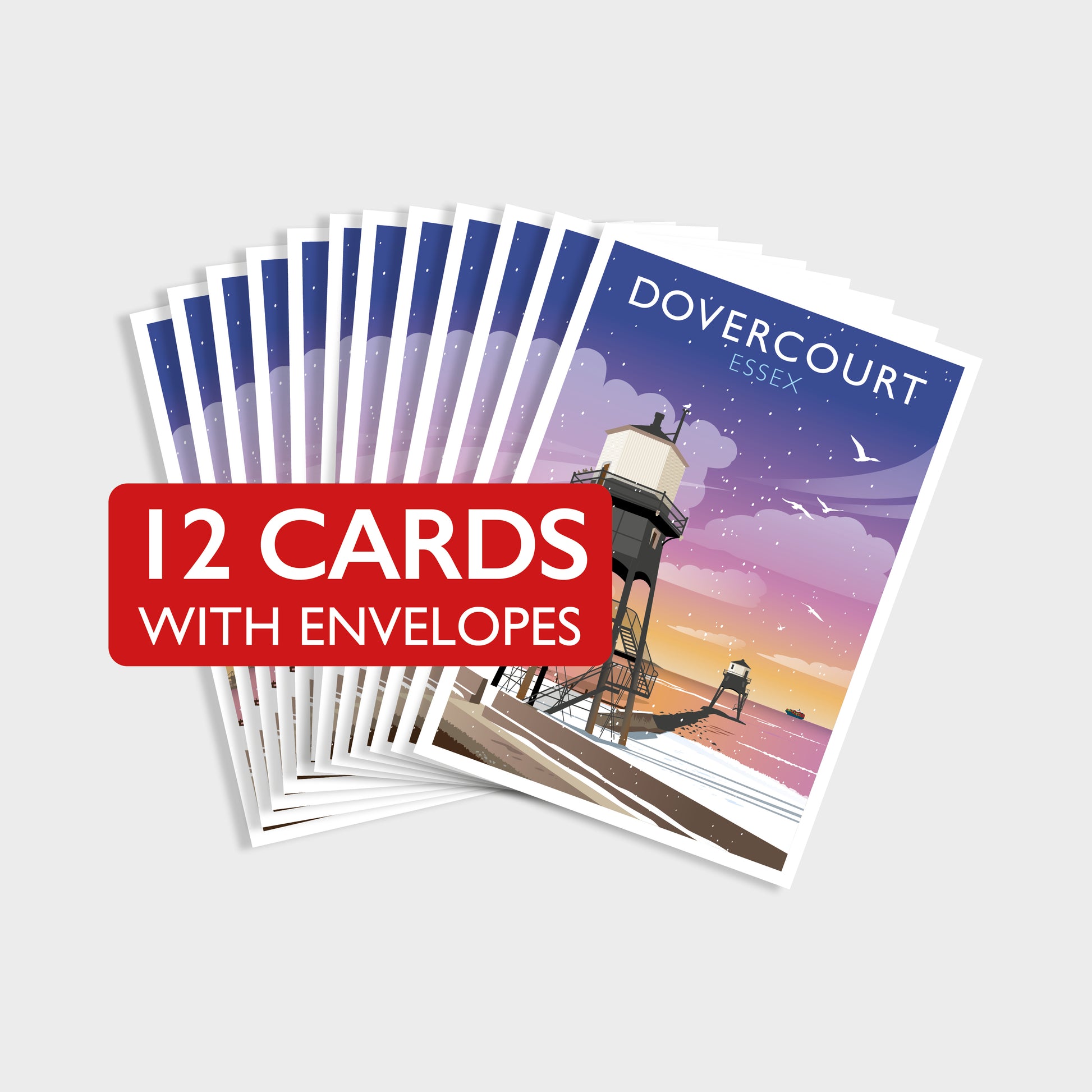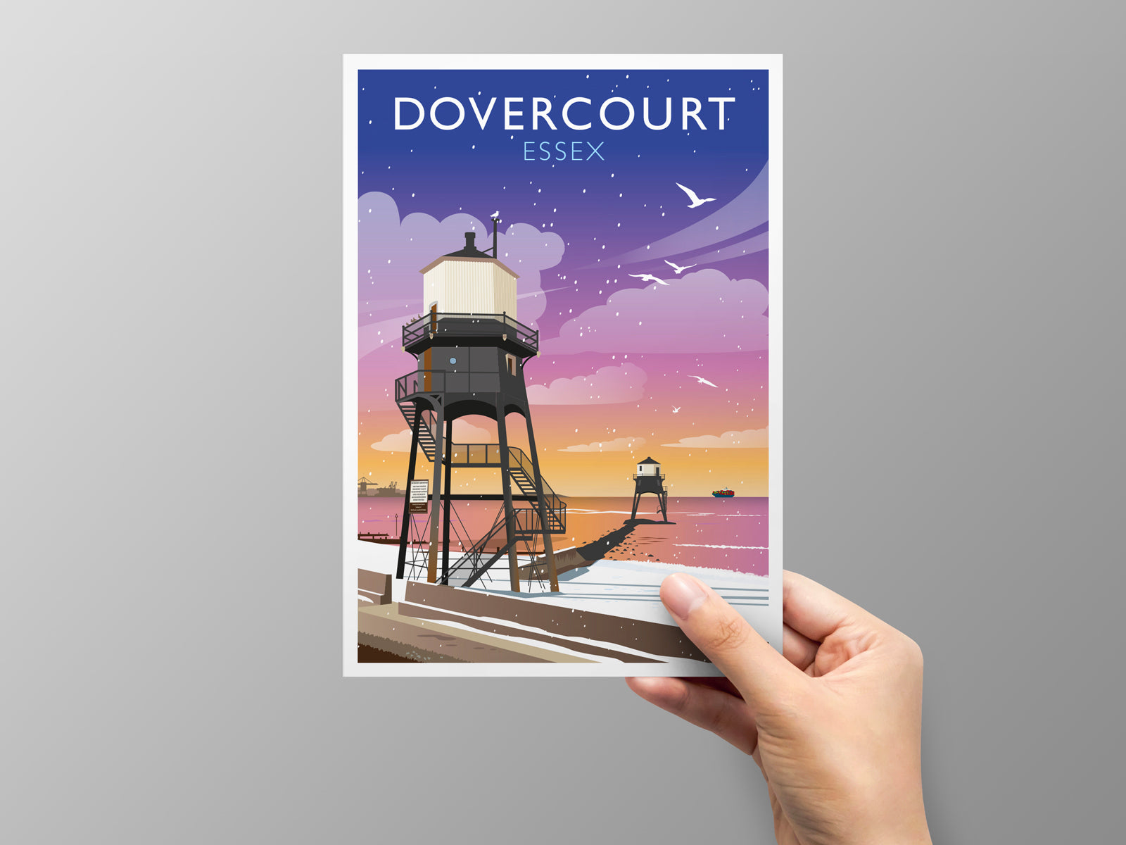 High quality Christmas card of Dovercourt, a seaside town on the Essex coast, contiguous with the town of Harwich. Dovercourt is a popular day trip destination, with a lovely beach providing impressive views of container ships passing by in the distance, heading to and from Harwich International Port. Dovercourt is home to a range of cafés, a boating lake, and a holiday park.