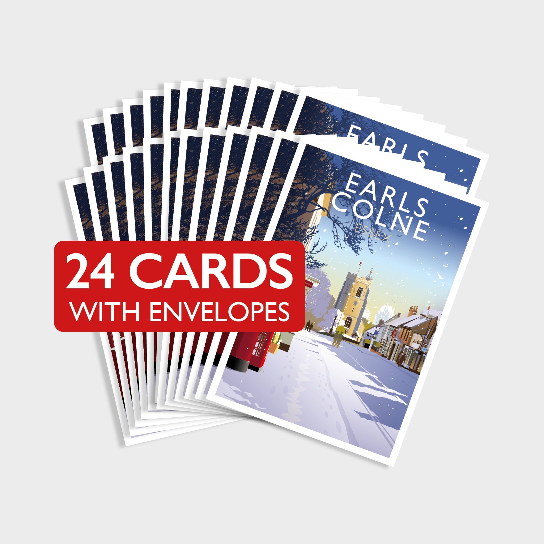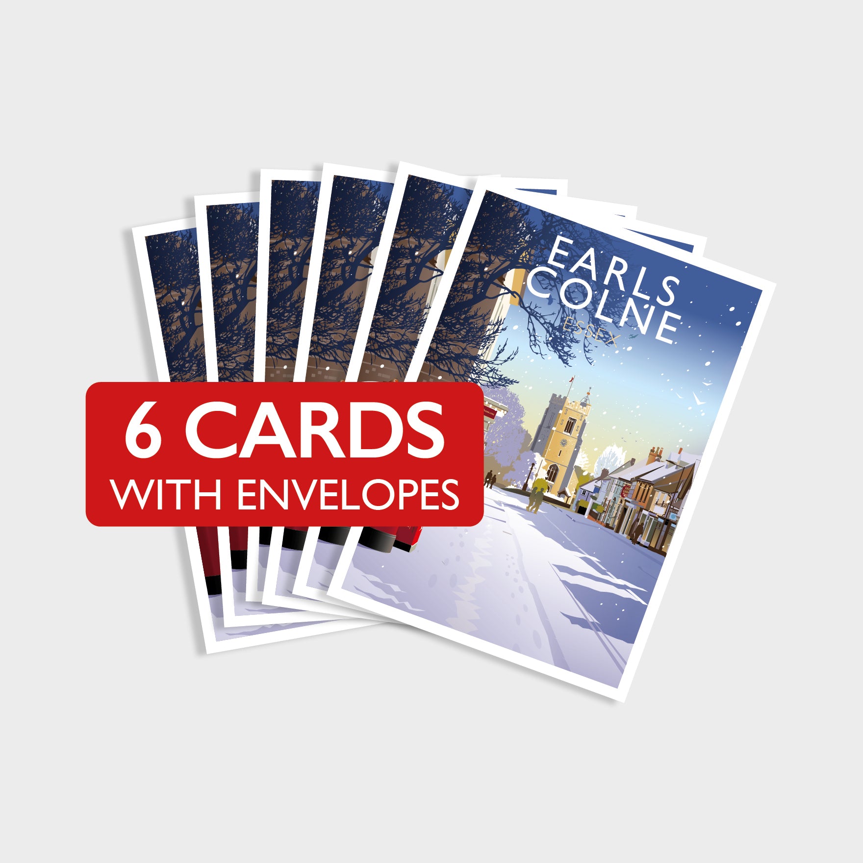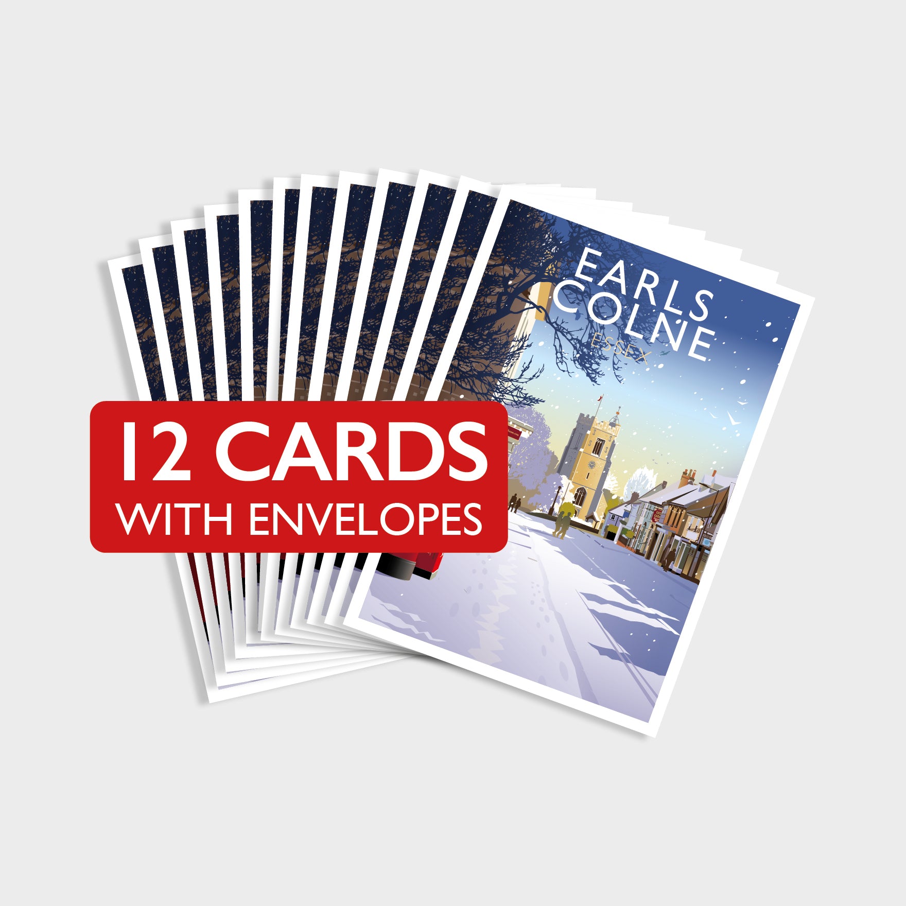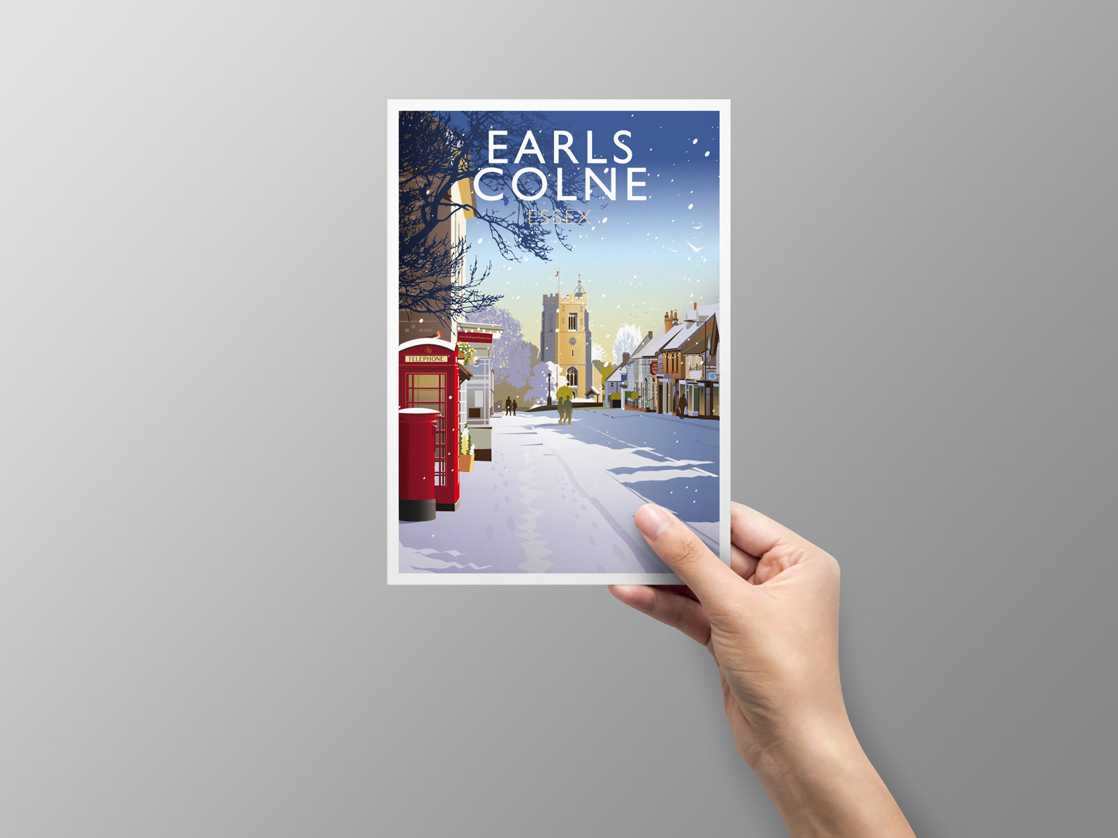 Depicted in this illustration is a view down Earls Colne high street towards the 14th-century St Andrew's Church. Also in the illustration is Earls Colne War Memorial, commemorating the people of the parish who gave their lives in the First and Second World Wars.