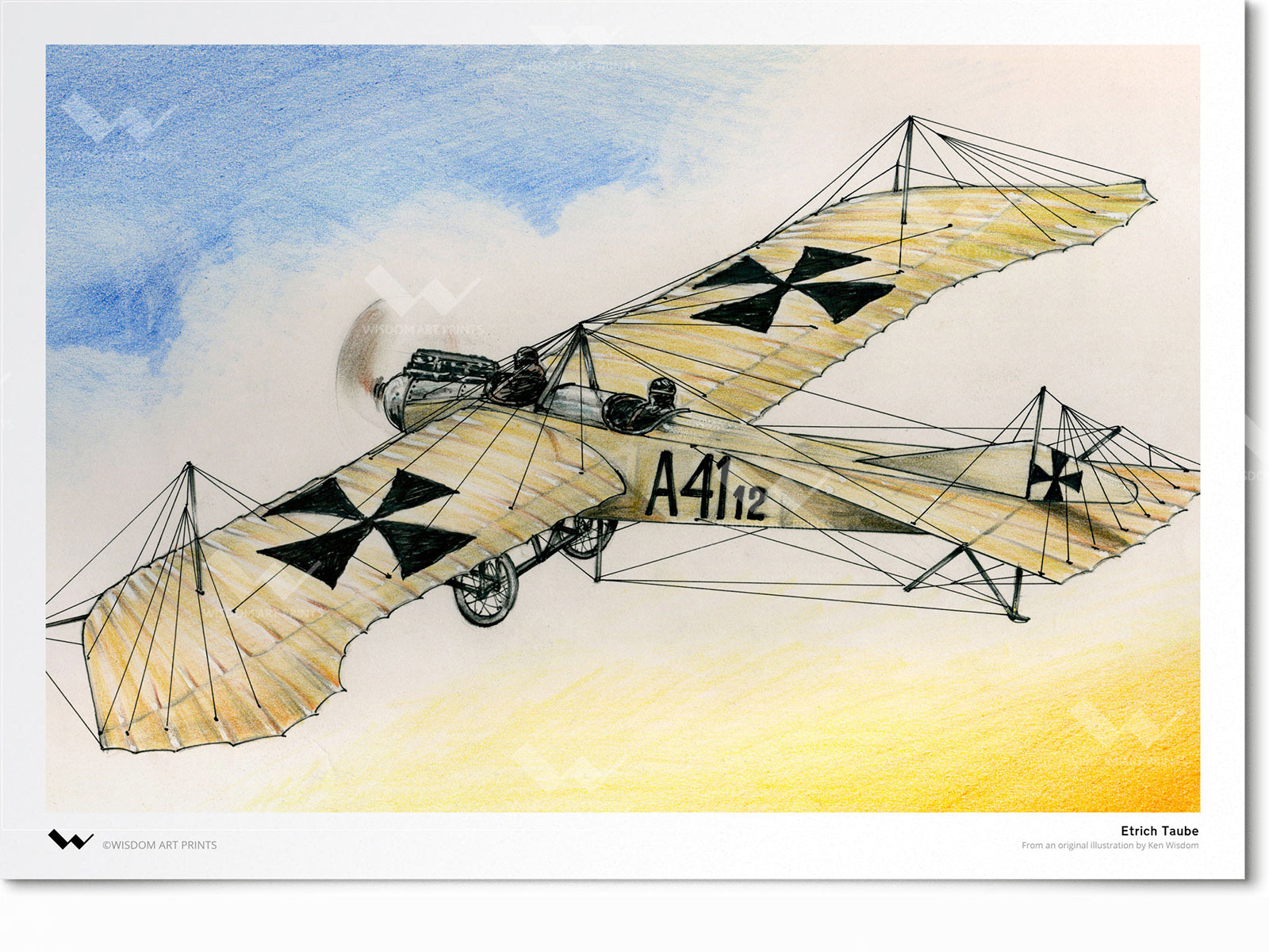 Original illustration of the Etrich Taube, a German biplane that was used by the Luftstreitkräfte in the opening stages of the First World War. The first German military aircraft to enter mass-production, the Taube first flew in 1910, and proved an export success. In Italian service in the Italo-Turkish War, the Taube (piloted by Giulio Gavotti) delivered the first aerial bomb in history on 1 November 1911. By the outbreak of the First World War, the Taube was obsolete, and was withdrawn from service by 1915.