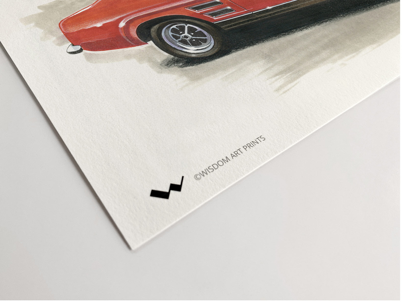 The Ford Capri is a classic fastback coupé, produced by Ford Motor Company from 1968 to 1986, for sale in the European market. The Capri sold almost two million units in its lifetime. This illustration depicts a Capri MkI 3000 GT, a 1969 gran turismo/grand tourer variant powered by a Ford V6 engine, and boasting improved performance.