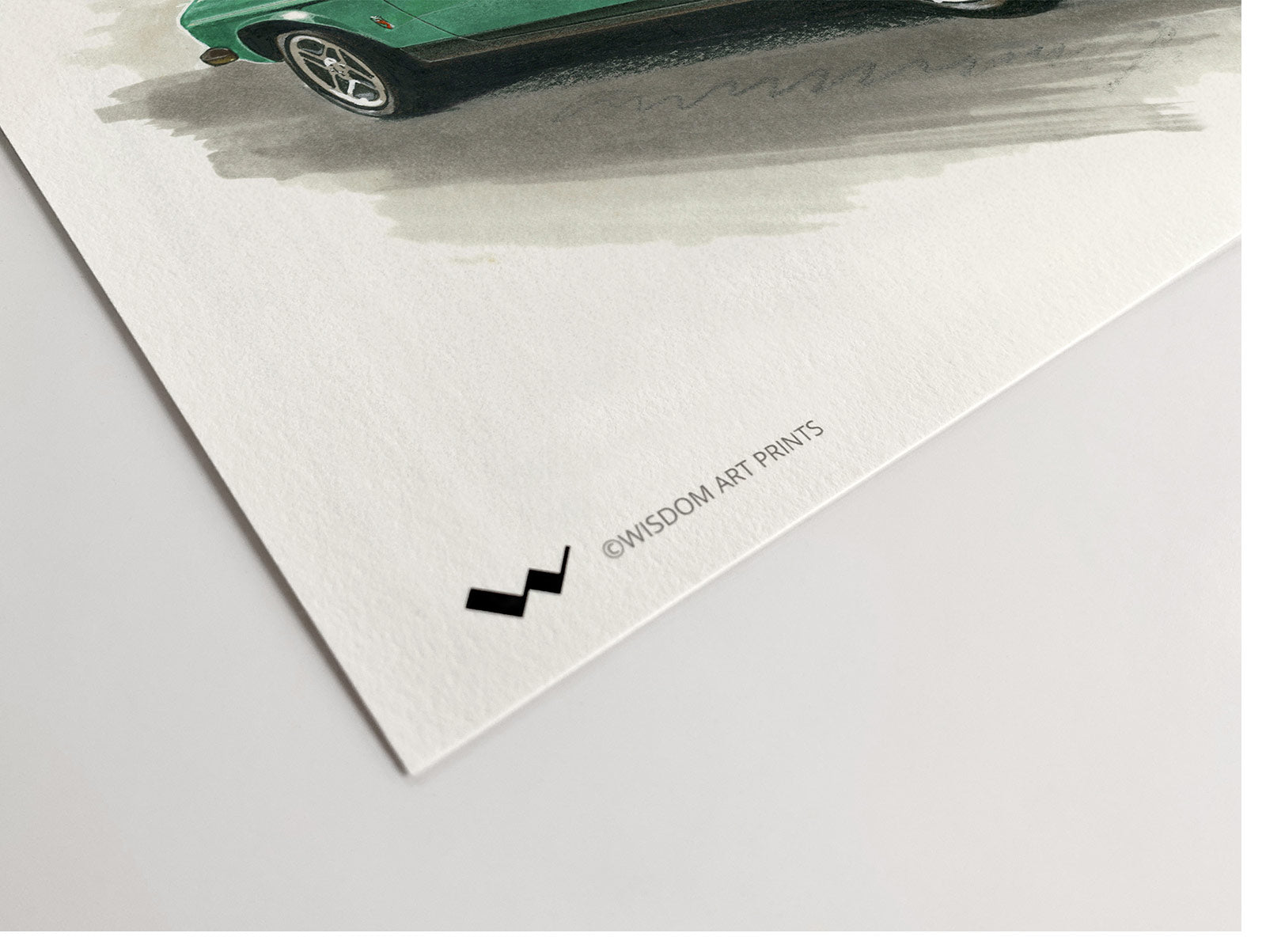 The Ford Capri is a classic fastback coupé, produced by Ford Motor Company from 1968 to 1986, for sale in the European market. The Capri sold almost two million units in its lifetime. This illustration depicts a Capri MkI RS3100, powered by a 3.1 L Ford V6, and designed with performance motorsport and racing in mind.