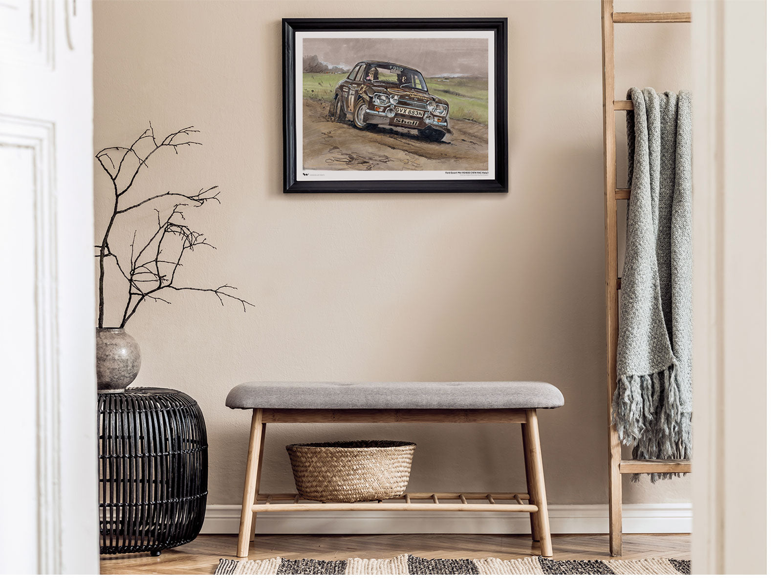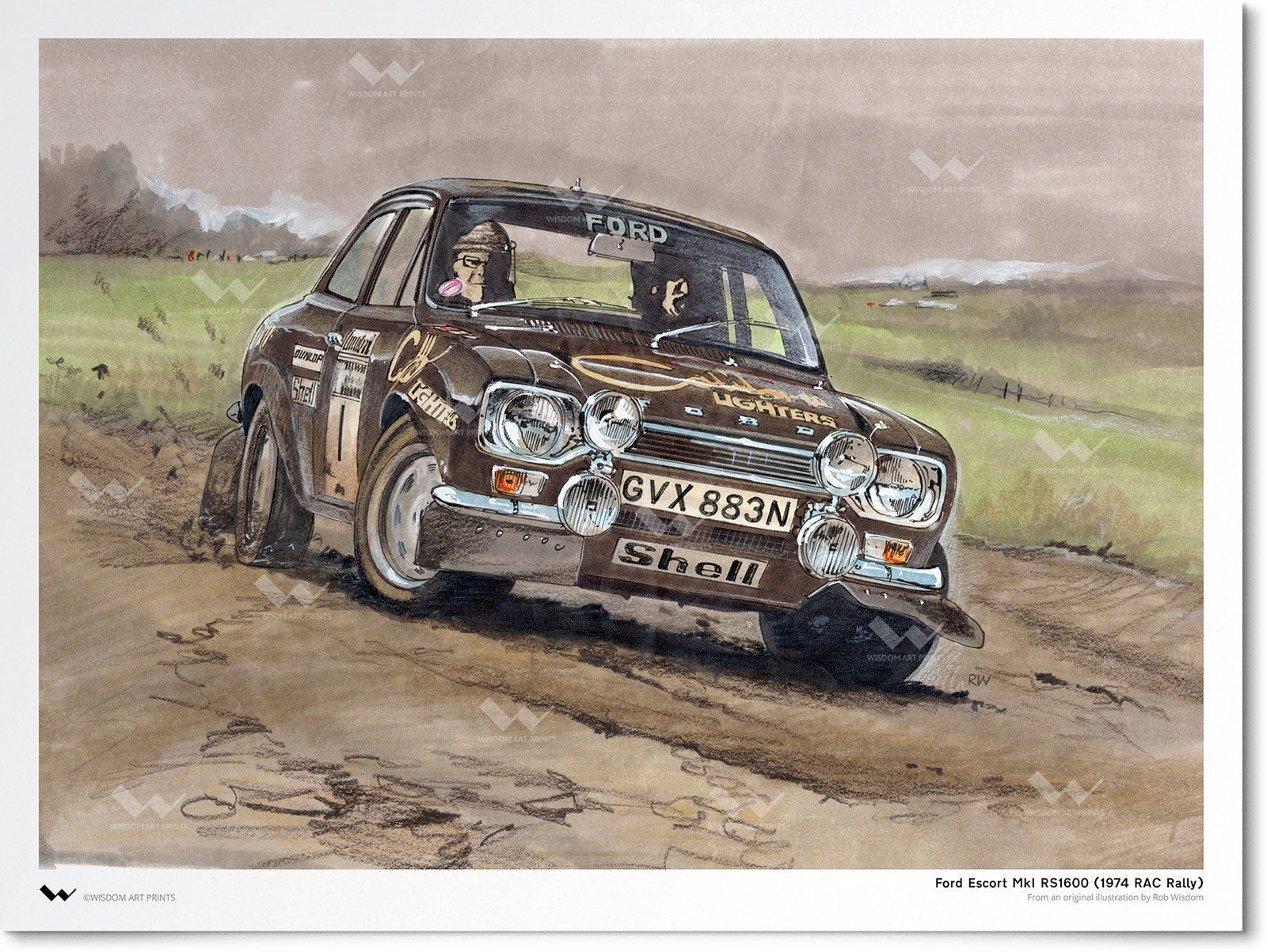 The European Ford Escort, best known as a classic family car, also has a long track record in motorsport events such as motor rallying. This illustration depicts a Ford Escort MkI RS1600 competing in the 1974 RAC Rally (now known as the Wales Rally GB and, on one occasion, the Rally of Great Britain). 'Flying Finn' Timo Mäkinen drove a Ford Escort MkI RS1600 on his way to winning the race, defending his title from the year before, also won in an Escort MkI.