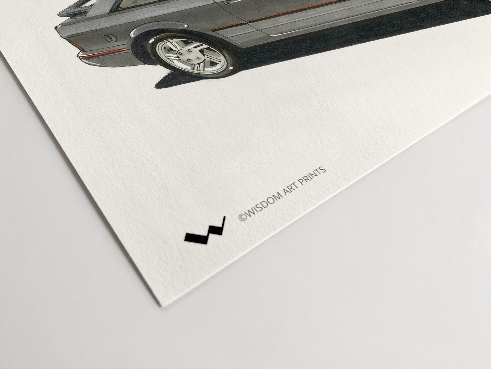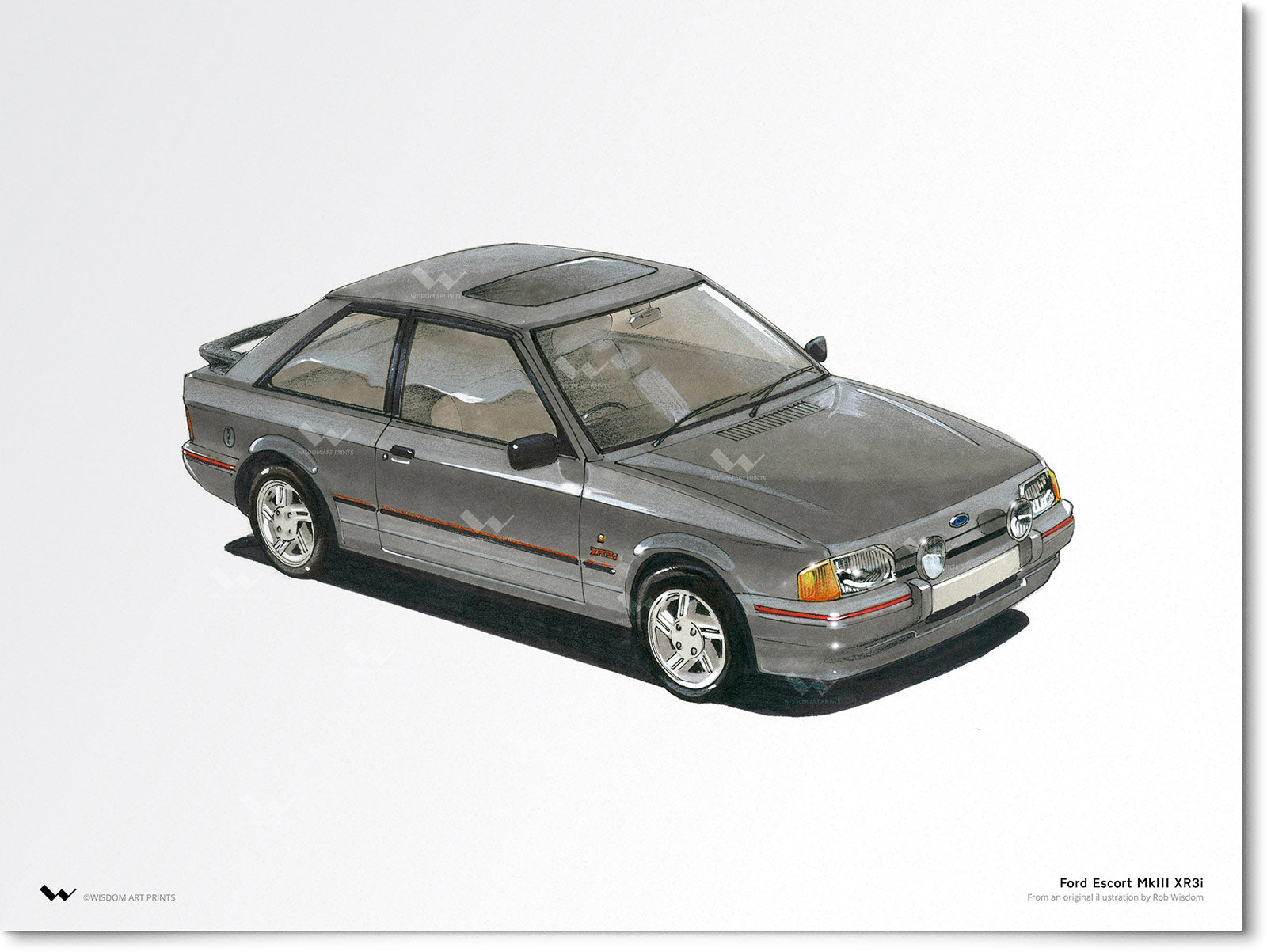The European Ford Escort, initially introduced by Ford Europe as a classic family car, would later branch out into higher performance models. One such model was the Escort MkIII XR3i, 1982's follow-up to the high-performance hot hatch XR3. The XR3i built upon 1980's XRC with the addition of fuel injection, in order to better compete with the performance of the Volkswagen Golf GTI. This illustration depicts an XR3i in grey, with red trimmings.