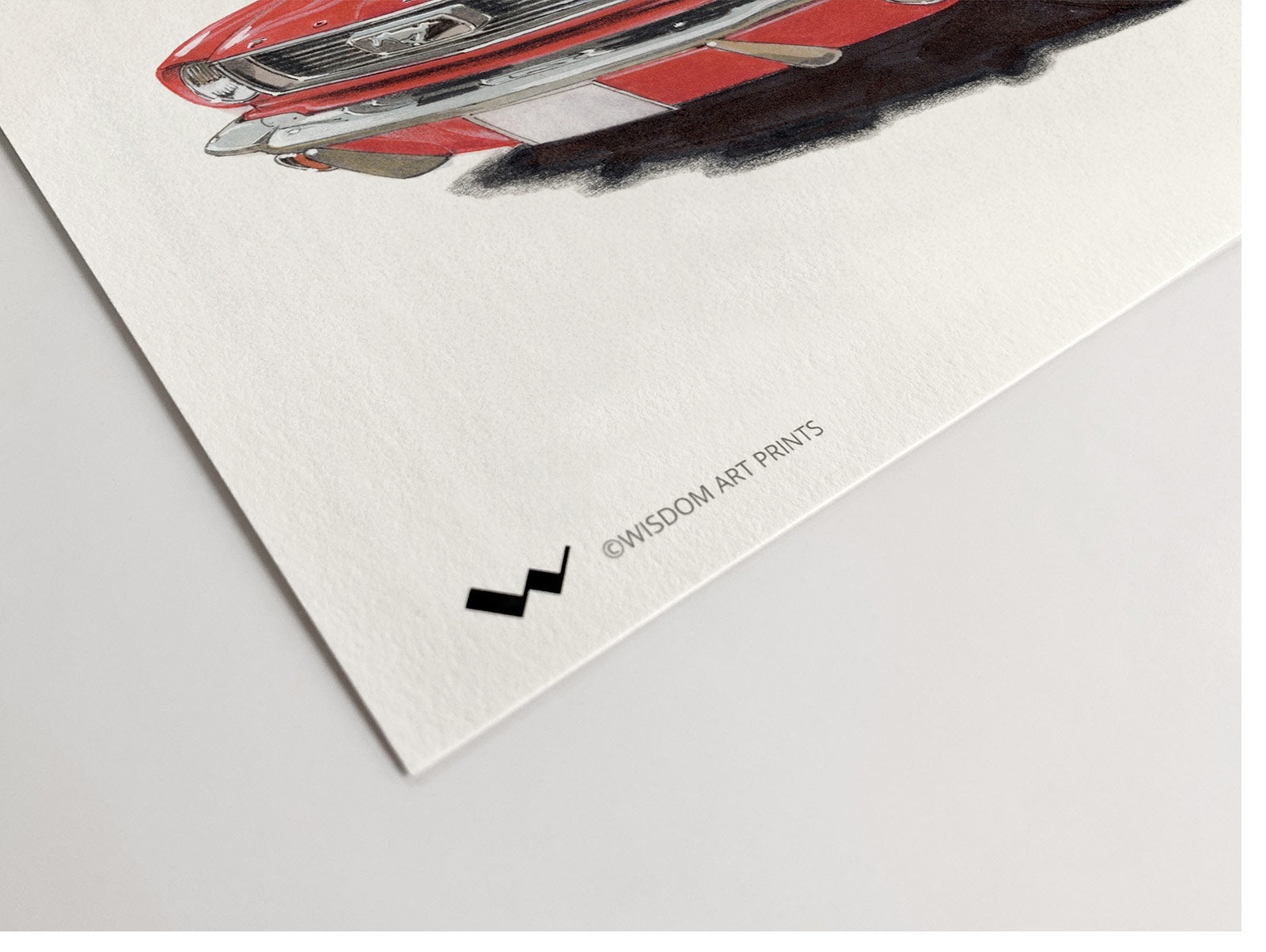 In production since 1964, the Ford Mustang is American automobile manufacturer Ford's longest-running series of cars. This illustration depicts a 1966 Ford Mustang 2-door coupé, in classy red and white livery.