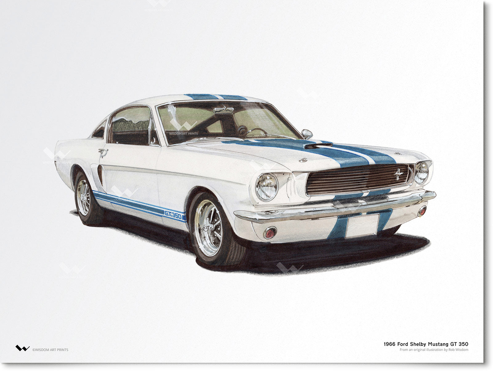 The result of collaboration between American automobile manufacturers Ford and Shelby, the Ford Shelby Mustang - also known simply as a Shelby Mustang - was produced from 1965 to 1970. This illustration depicts a 1966 Shelby Mustang GT 350 - nicknamed the "Cobra" by some - with a 4.7 L Windsor K-Code V8 engine.
