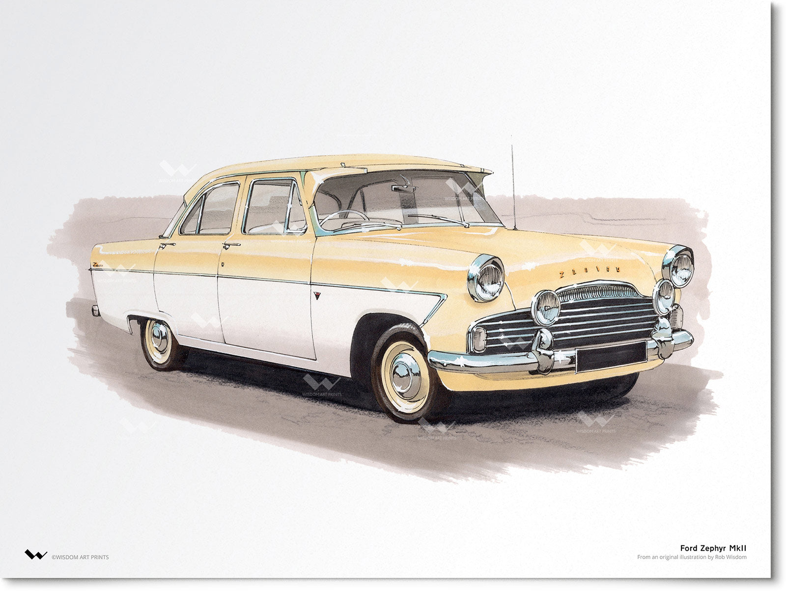 The Ford Zephyr is a classic executive car, produced by Ford UK (Ford of Britain, from 1962) from 1950 to 1972. This illustration depicts a Zephyr MkII (1956-1962) 4-door saloon. The Zephyr MkII featured a 2.5L straight-6 OHV engine.