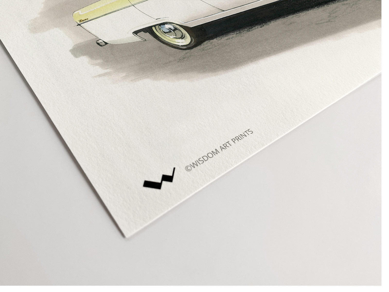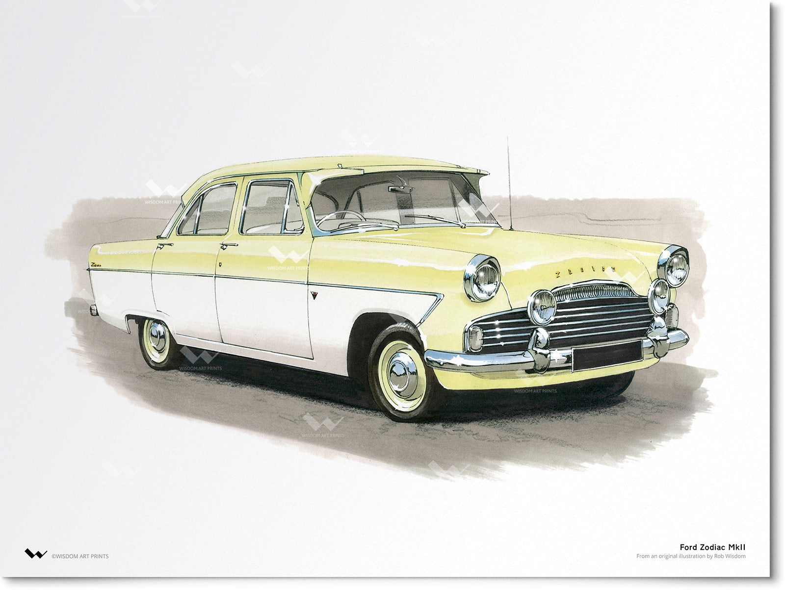 The Ford Zodiac (also known as the Ford Zephyr Zodiac) is a classic executive car, an offshoot of the more widely-known Ford Zephyr. Aimed at a more upmarket audience, the Zodiac focused on style, with two-tone paint and leather upholstery. This illustration depicts a Zodiac MkII 4-door saloon, which ran along the Zephyr MkII from 1956 to 1962.