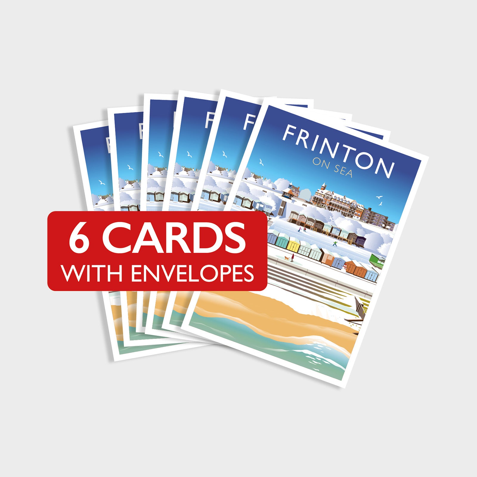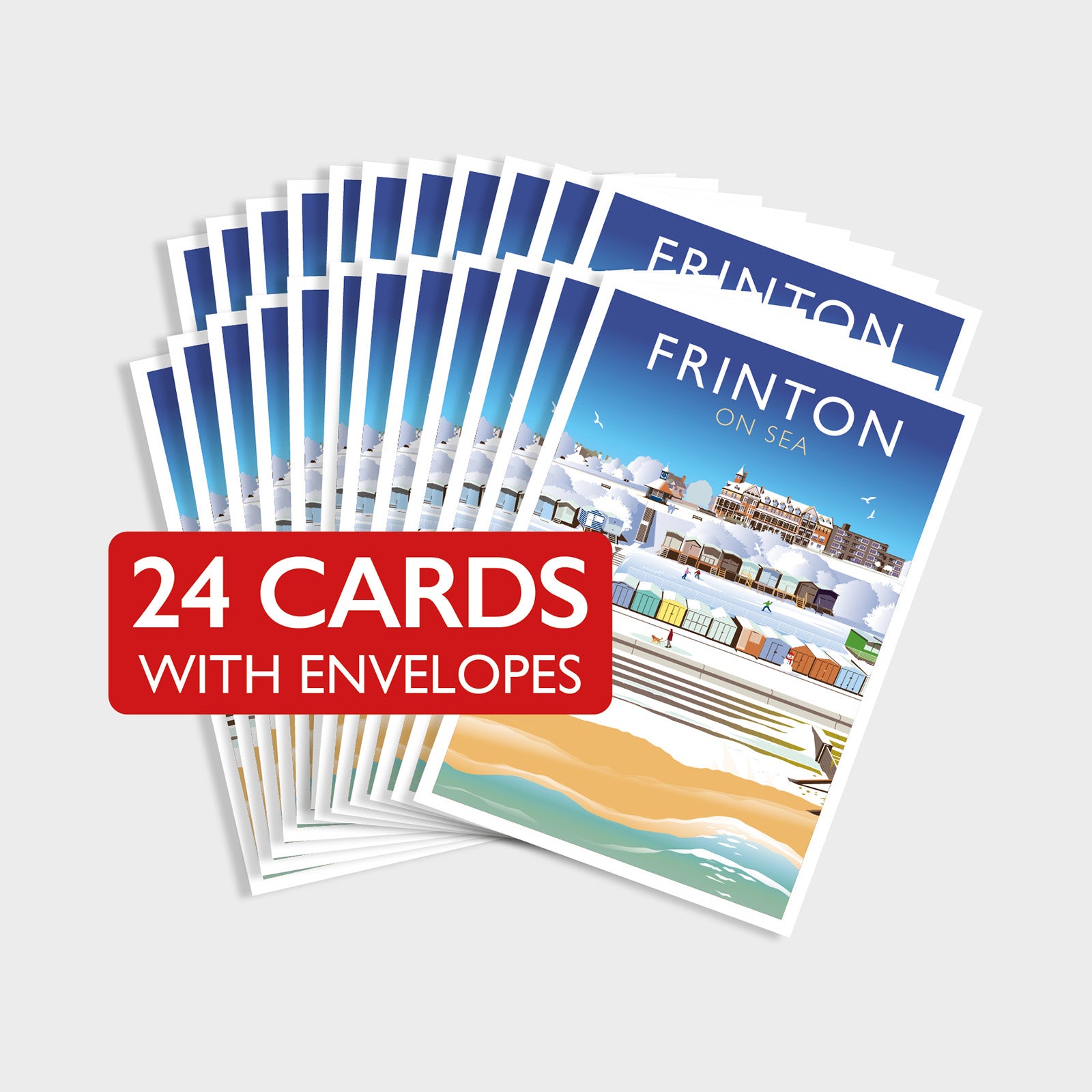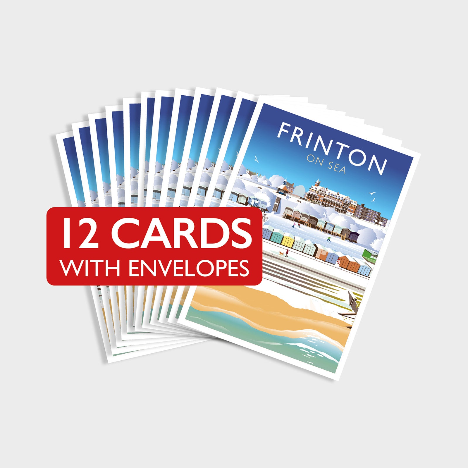 High quality Christmas card of Frinton-on-Sea in Tendring, Essex. A seaside town, Frinton is known for its sandy beach - which has been named one of the UK's best - and ranks of colourful Victorian-style beach huts, as seen in this illustration. Frinton borders upon Walton-on-the-Naze to the north-east, and is a few miles from Holland-on-Sea and Clacton-on-Sea to the south-west.