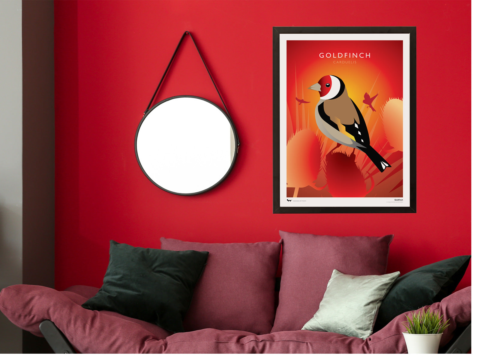 One of a collection of illustrations by Rob Wisdom, depicting Britain's most beloved birds. Goldfinches can be identified by their distinctive gingery-brown colouring and red faces, and are widespread across the British Isles throughout much of the year - though many Goldfinches migrate south, as far as Spain, to escape cold temperatures during the winter.