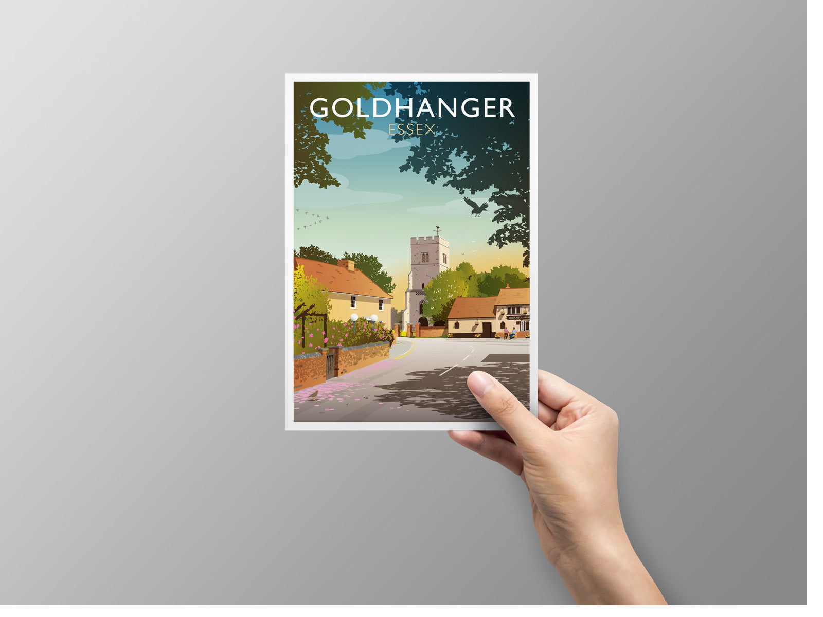 High quality greeting card of Goldhanger, a pretty little village in the District of Maldon, Essex. There are some beautiful walks around Goldhanger with miles of sea wall to enjoy stretching along the Blackwater Estuary as far as Maldon on one side and Tollesbury and beyond on the other. St Peter's Church which is in the heart of the village, dates back to the 11th century and features in our illustration along with the Chequers Inn pub. The church's tower is home to 8 bells. There are only eight roads in Goldhanger: Head Street, Fish Street, Church Street, St Peter's Close, Maldon Road, Hall Estate, Sorrell Close, and finally Blind Lane.