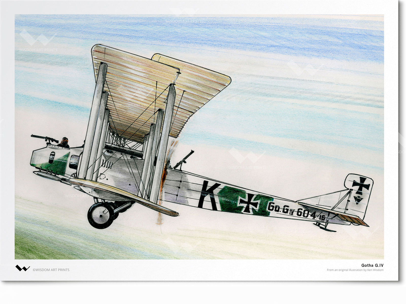 Original illustration of the Gotha G.IV heavy bomber, as used by the German Luftstreitkräfte during the First World War. Production of the G.IV began in 1916, with its introduction to service in March 1917. It was operated through to the end of the war, at which point all surviving examples were destroyed - save one, which had been captured by the Polish and went on to be used during the Polish-Soviet War.