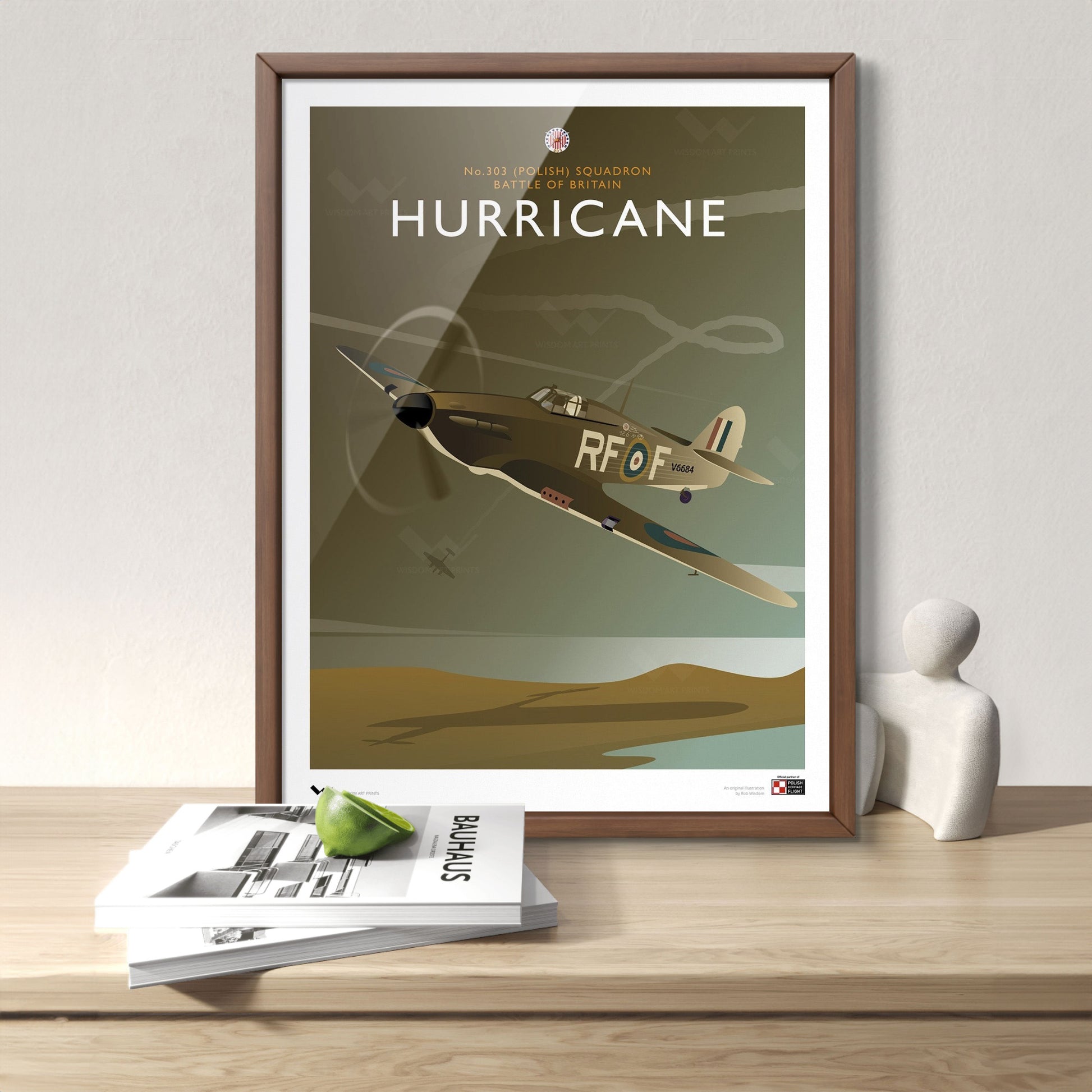 Original art print of the Hawker Hurricane fighter, as flown by No. 303 "Kościuszko" Polish Fighter Squadron of the Royal Air Force (RAF) during the Second World War. No. 303 Squadron was one of several fighter squadrons formed from veterans of the Polish Air Force. 303 Squadron was the most successful of the 66 Allied fighter squadrons to take part in the Battle of Britain, claiming a final tally of 126 aircraft destroyed. Two top aces flew with the squadron, Josef František (a Czechoslovak, the highest scoring foreign Allied ace of the Battle of Britain) and Witold Urbanowicz (the highest scoring Polish ace of the war, and, for a time, commander of 303 Squadron).