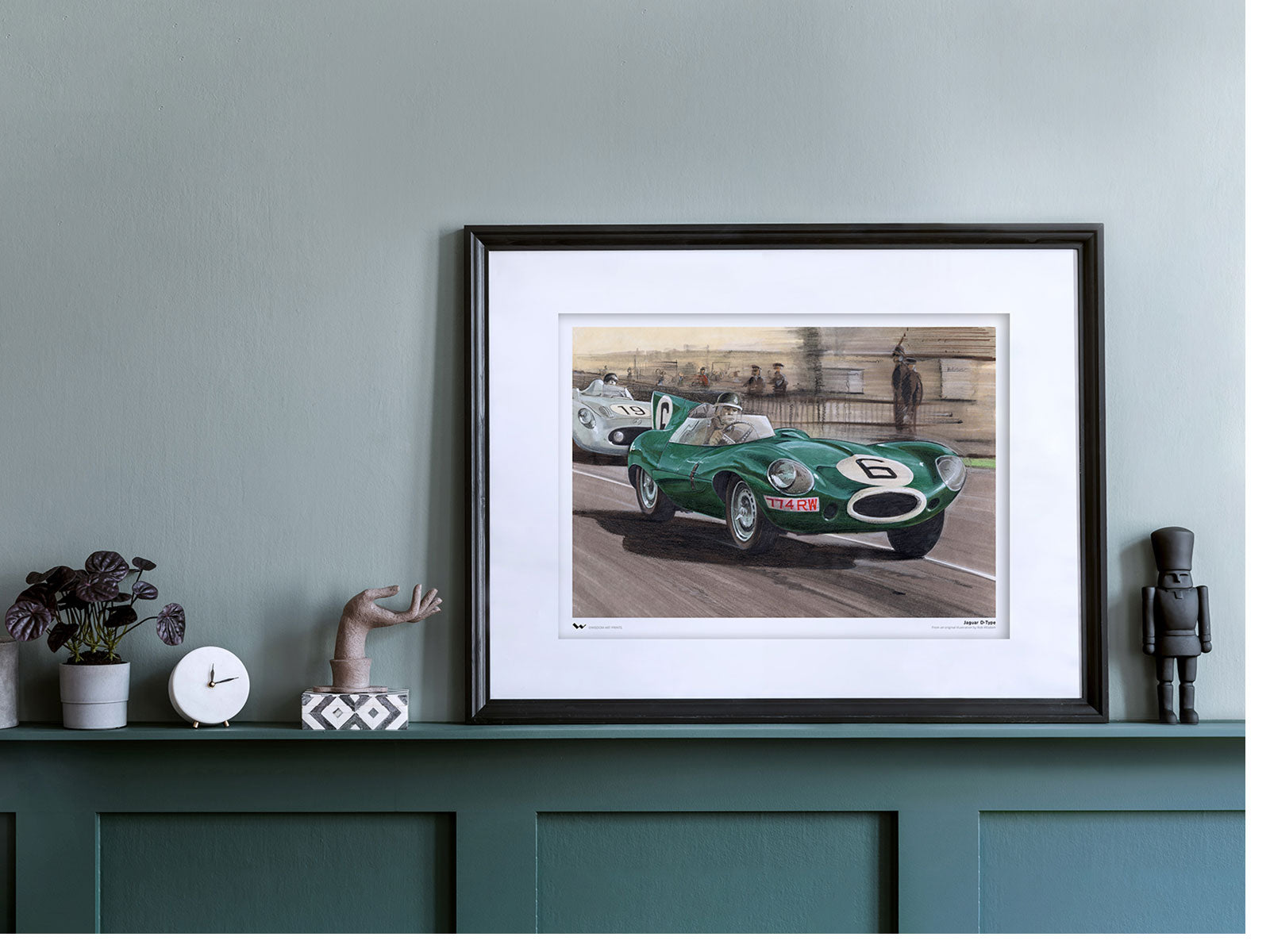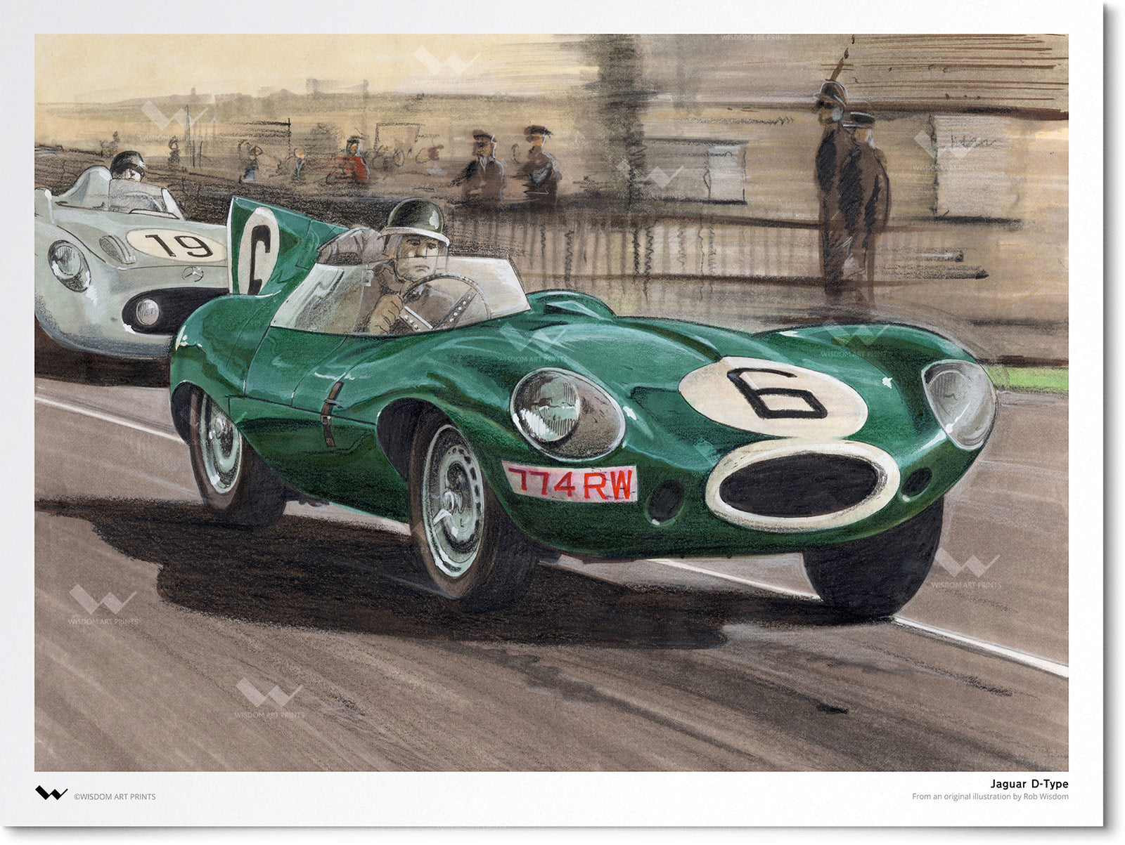 The Jaguar D-Type is a classic sports racing car that was manufactured by Jaguar from 1954 to 1957. The D-Type was built from the ground up to win the 24 Hours of Le Mans endurance race - and successfully so, as it won three years in a row - 1955, 1956, and 1957 - before being unseated by the Ferrari 250 TR58 in 1958. The D-Type would later be released as a 2-door roadster for the consumer market, though only 16 such cars were built and sold. This illustration shows a D-Type in British racing green.