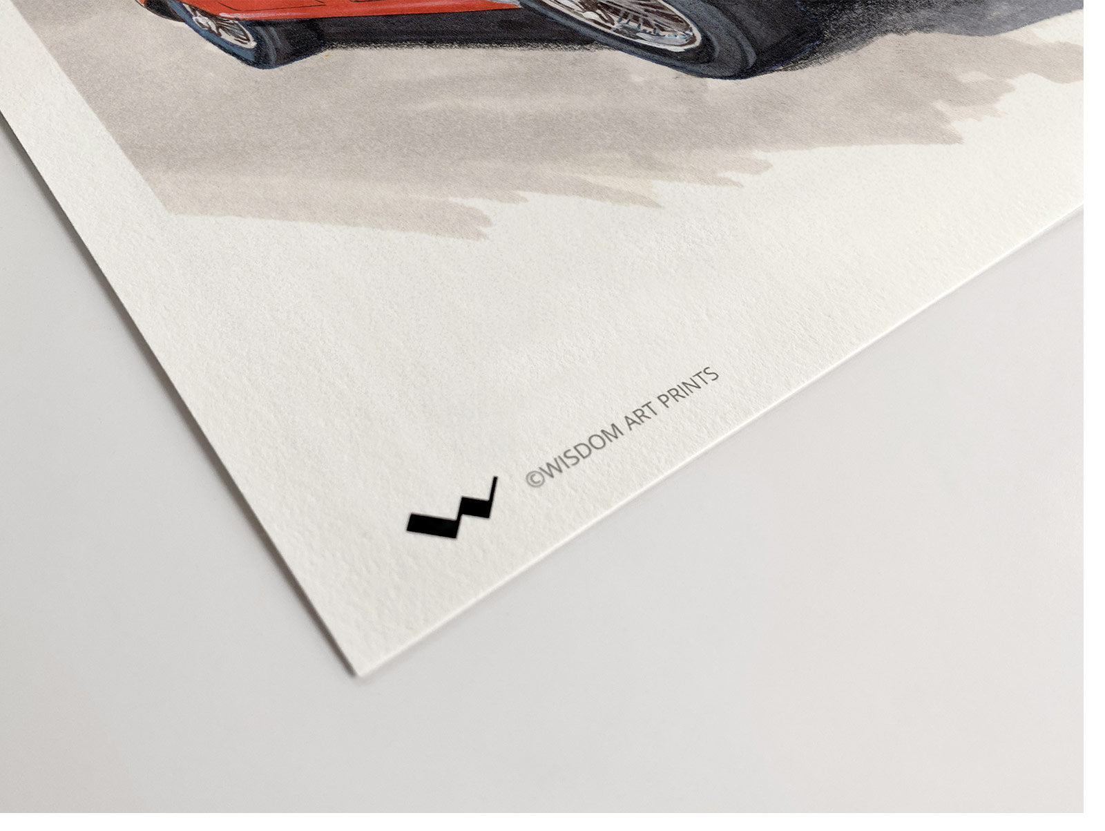 The Jaguar E-Type, known as the Jaguar XK-E in North America, is a classic sports car manufactured by Jaguar from 1961 to 1975. Combining beautiful aesthetics and elite performance, the E-Type is one of the most iconic sports cars of all time. This illustration depicts an E-Type Series 1, which launched in 1961 with a 3.8L XK I6 engine - this would be upgraded later in Series I's seven-year run with the introduction of a 4.2L XK I6.