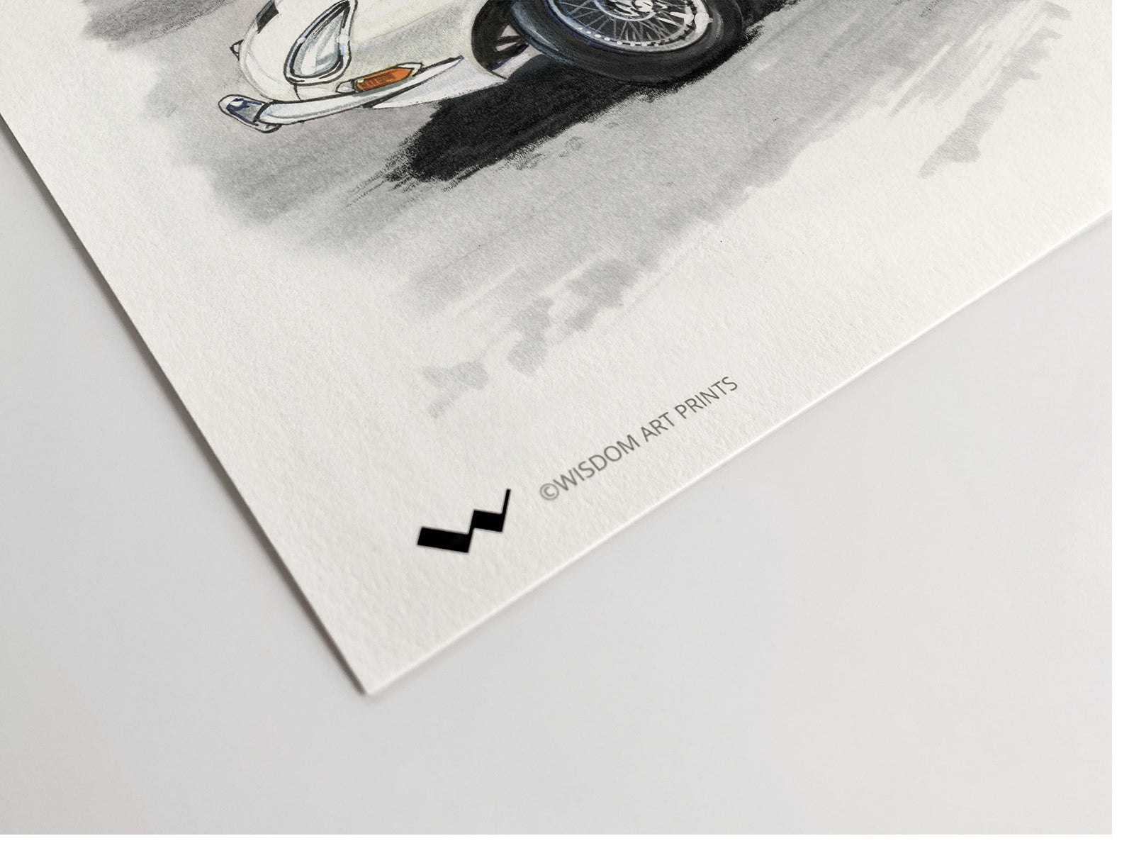 The Jaguar E-Type, known as the Jaguar XK-E in North America, is a classic sports car manufactured by Jaguar from 1961 to 1975. Combining beautiful aesthetics and elite performance, the E-Type is one of the most iconic sports cars of all time. This illustration depicts an E-Type Series 1 2-door roadster, produced between 1961 and 1968.