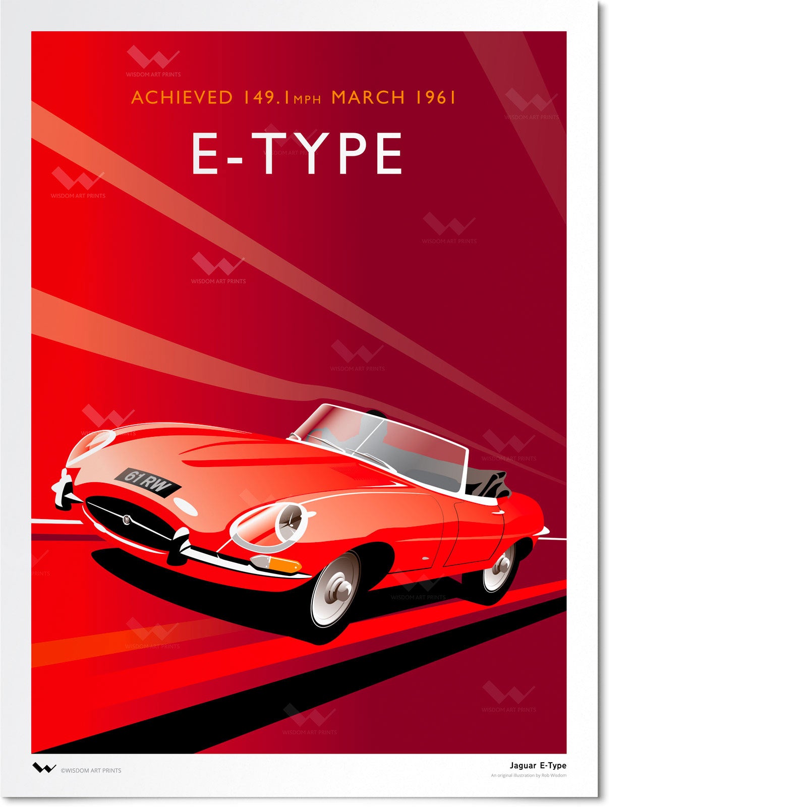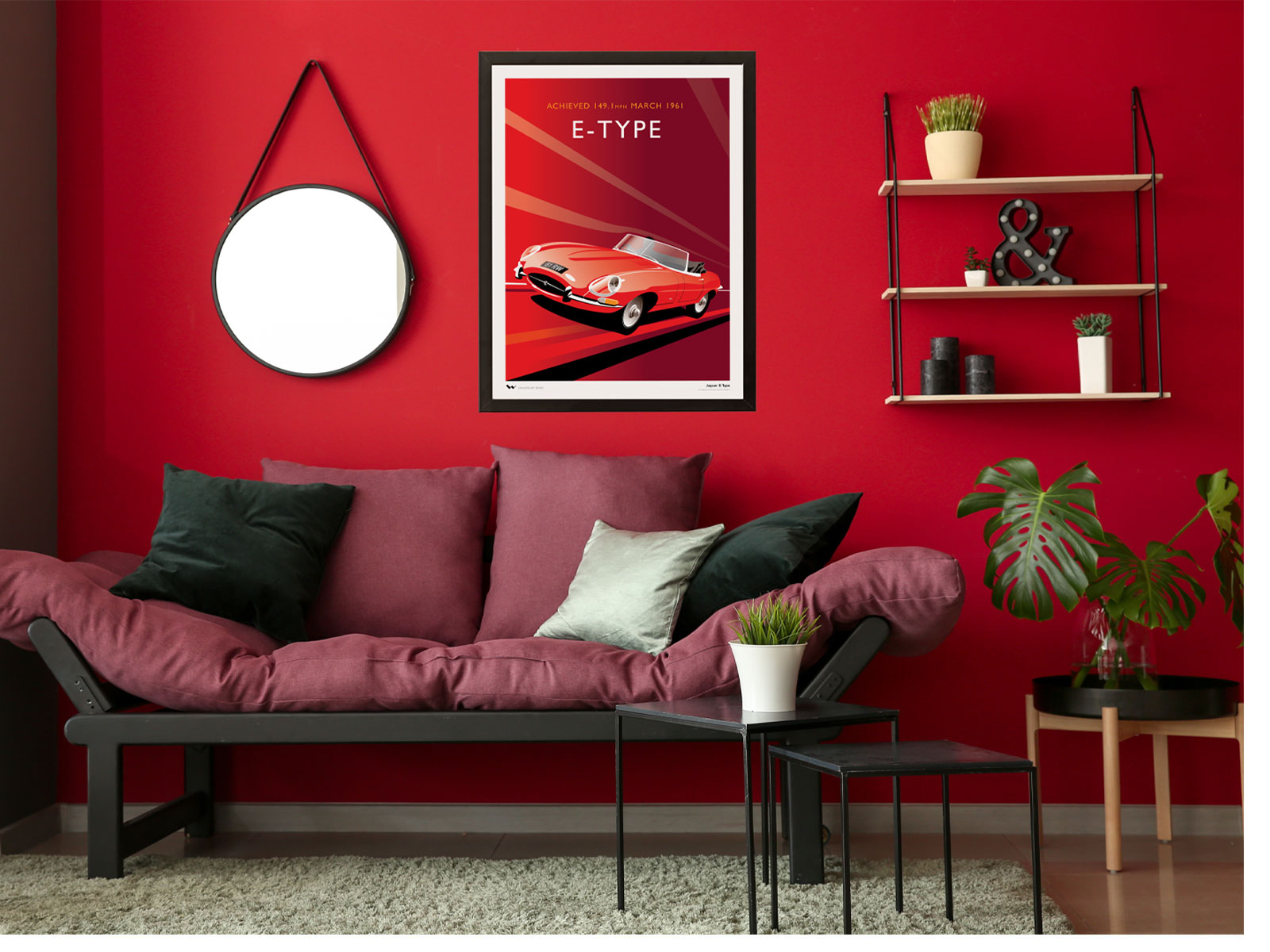 High-quality art print of the Jaguar E-Type, perhaps the most iconic sports car in British automotive history. Introduced in 1961, the E-Type boasted impressive speed (149.1mph) and acceleration (doing 0 to 60 in less than seven seconds) but it is the car's beauty that has truly sealed its iconic status. Indeed, it is rumoured that Enzo Ferrari himself called the E-Type "the most beautiful car ever made." The E-Type would remain in production from 1961 through to 1974, in three series - a total of 18,808 E-Types were produced in all.