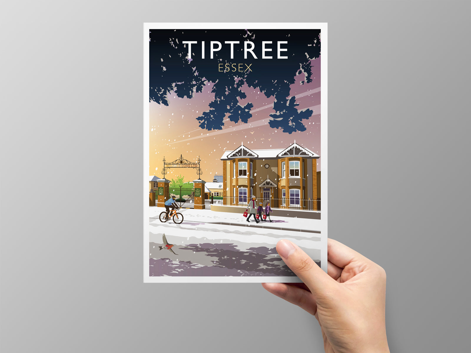 High quality Christmas card of Tiptree, Essex, depicting the top of Factory Hill, near the crossroads and the War Memorial. Factory Hill takes its name from the Wilkin and Sons jam factory that has been based in the village for well over a century, and this view shows beyond the formal entrance and recently-restored iconic factory gates.