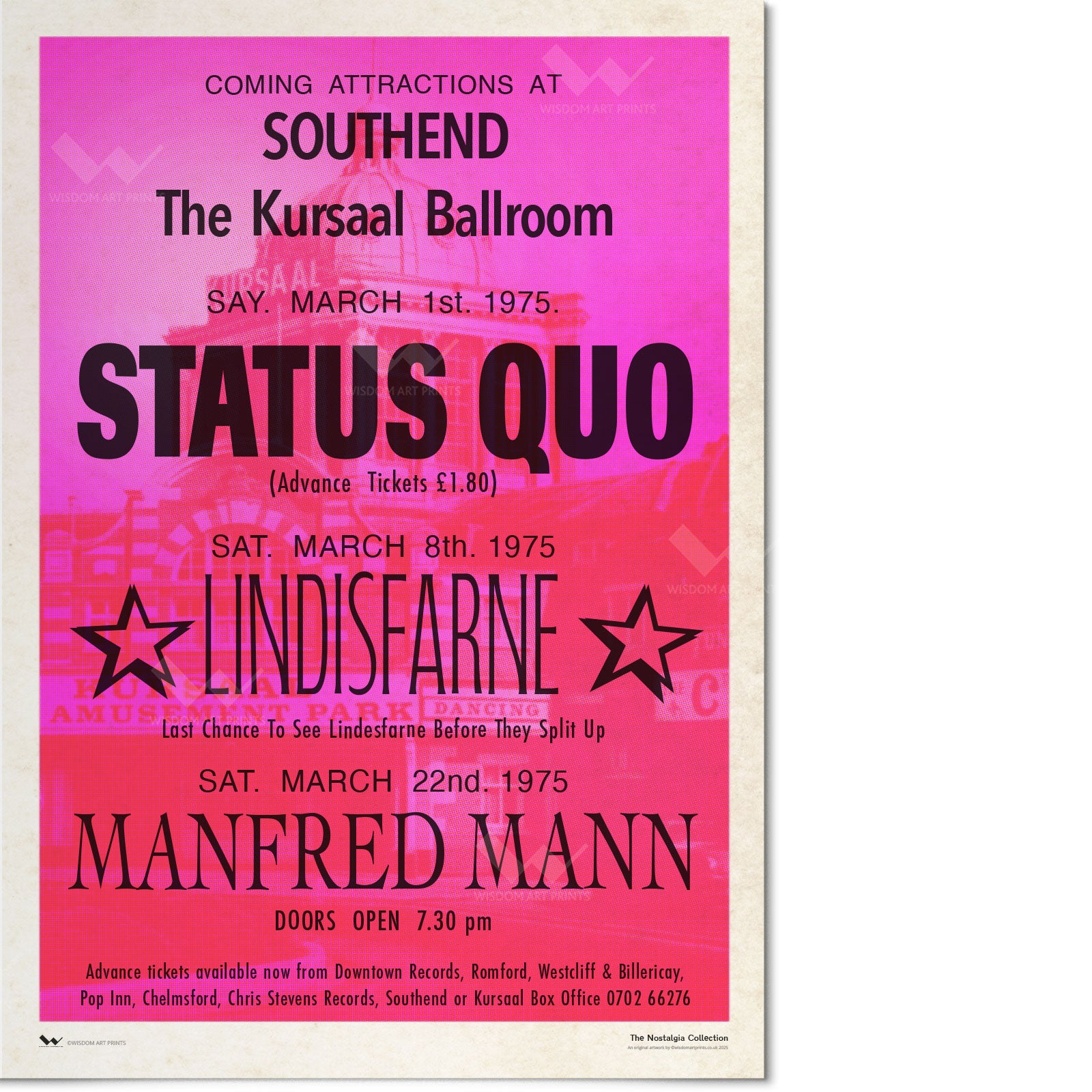 High-quality Giclée art print recreating a nostalgic poster of the past. This poster promoted three rock music events at the Kursaal Ballroom in Southend-on-Sea, Essex: Status Quo (1st March 1975), Lindisfarne (8th March 1975), and Manfred Mann (22nd March 1975).