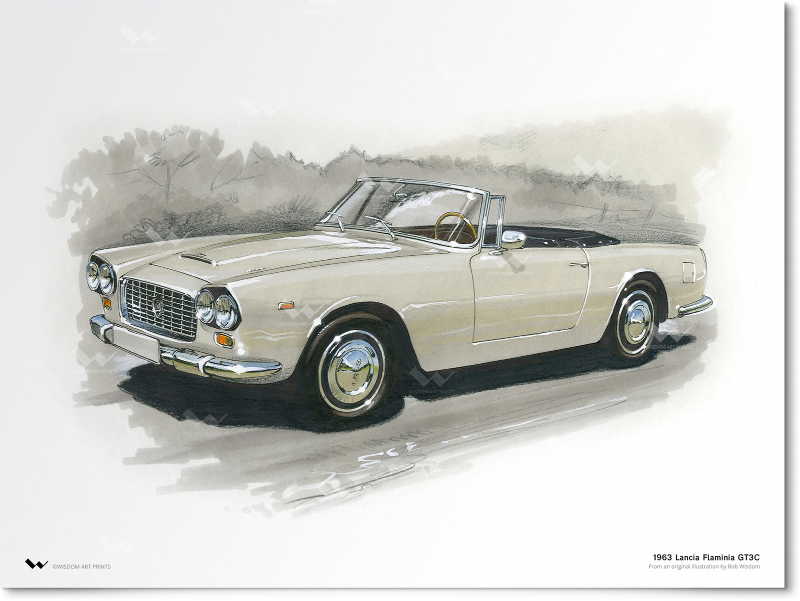 The Lancia Flaminia is a classic luxury car that debuted in 1957, replacing the Lancia Aurelia, and continued to be produced until 1970. This illustration depicts a 1963 Lancia Flaminia GT3c.