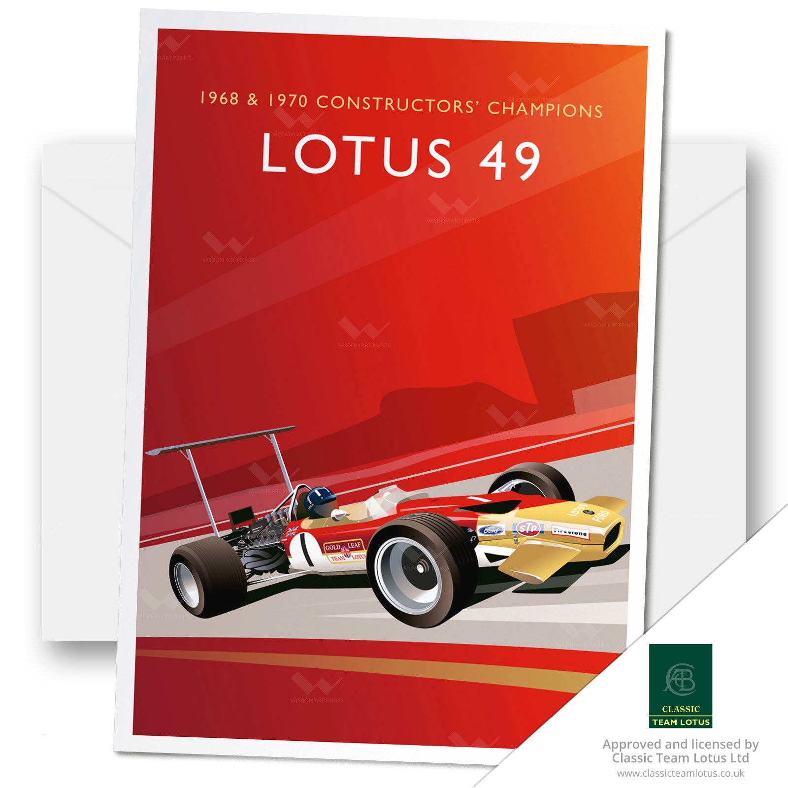 This Classic Team Lotus illustration by artist Rob Wisdom is a high-quality A5 greeting card. For our Giclée art print of the Lotus 49, click here.
