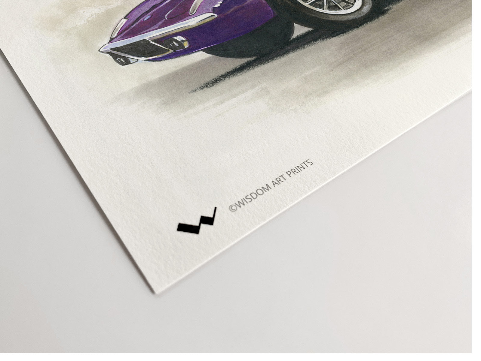 A classic sports car, the Lotus Elan was produced by Lotus Cars from 1962 to 1975. 1967 saw the introduction of the Elan +2, a 2+2 coupé rather than the traditional 2-seater configuration of earlier Elan models; the +2 would continue to be produced throughout the rest of the Elan's lifespan. This illustration depicts an Elan +2 in purple.