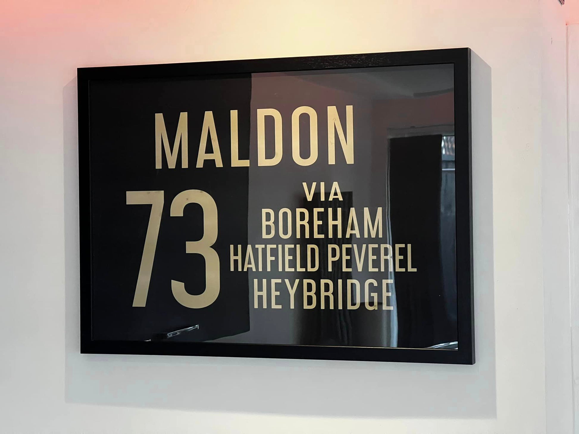 Bus blind depicting the Number 73 bus, headed for Maldon via Boreham, Hatfield Peverel, and Heybridge.