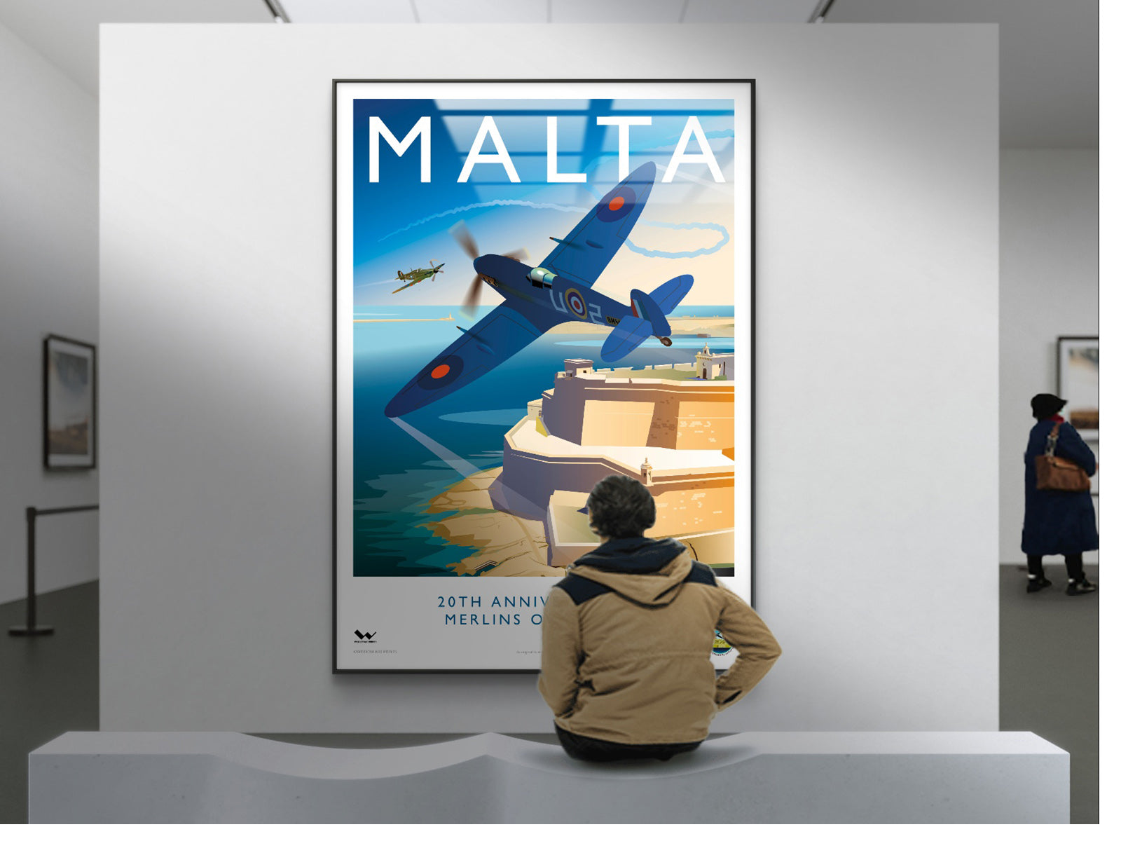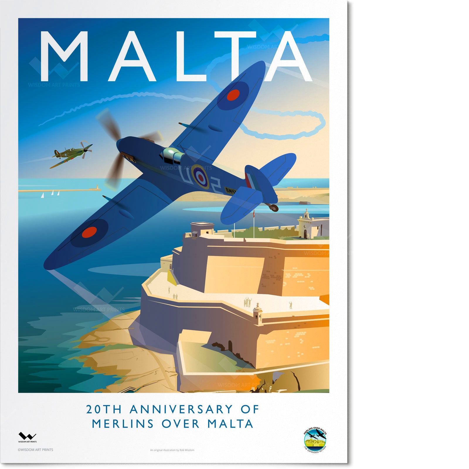 Commemorative 20th anniversary illustration celebrating the 2005 'Merlins Over Malta' project. During the Second World War, Malta was subjected to a brutal bombing campaign by the Axis, with Hawker Hurricanes and Supermarine Spitfires among the Allied aircraft flown in its defence. In September 2005, the Merlins Over Malta project flew a Supermarine Spitfire and Hawker Hurricane - piloted by Clive Denney and Charlie Brown - over Malta's Grand Harbour, as part of Malta's celebrations on the sixtieth anniversary of the end of the war. This was the first time either of the aircraft had been seen above the island since 1952.