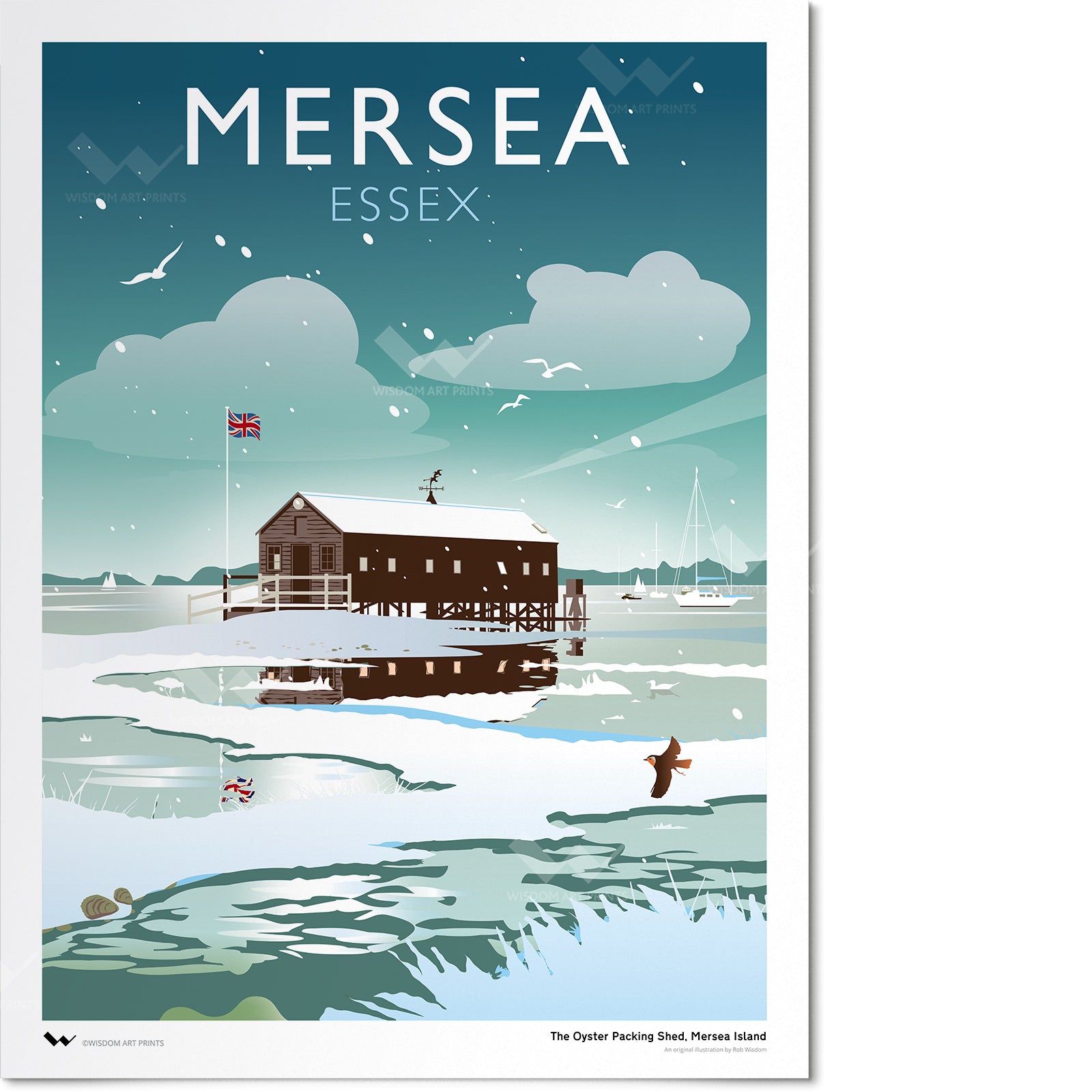 High quality art print of the Packing Shed on Mersea Island, Essex. Mersea is a tidal island in the Blackwater Estuary, connected to mainland Colchester borough by a causeway known as the Strood. Mersea is perhaps best known for its oyster industry, which stretches back to the Roman era.