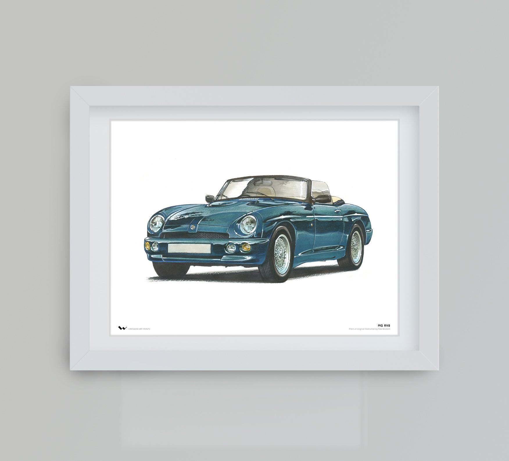 The MG RV8 is a classic sports car and the successor to the iconic MGB, manufactured from 1992 to 1995 using a reworked MGB model from 1980. The car was an instant classic, maintaining much of the MGB's 'old world' charm while modernising it with a 3.9 L V8 engine and several other important engineering upgrades. Primarily sold in Japan, the MG RV8 - depicted in this illustration - is now popular among British collectors.