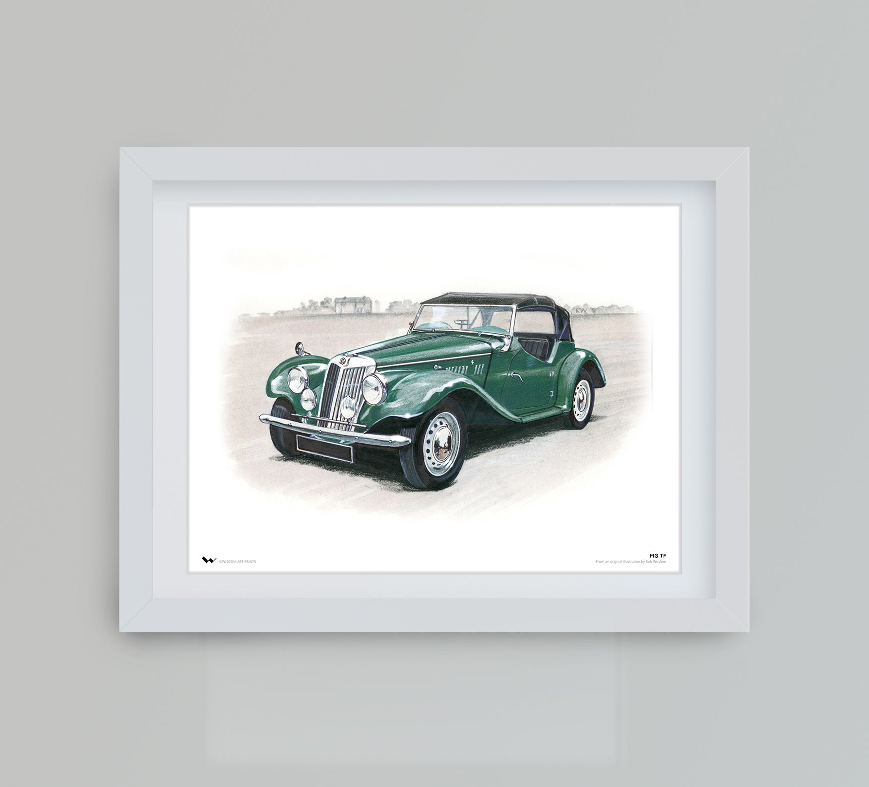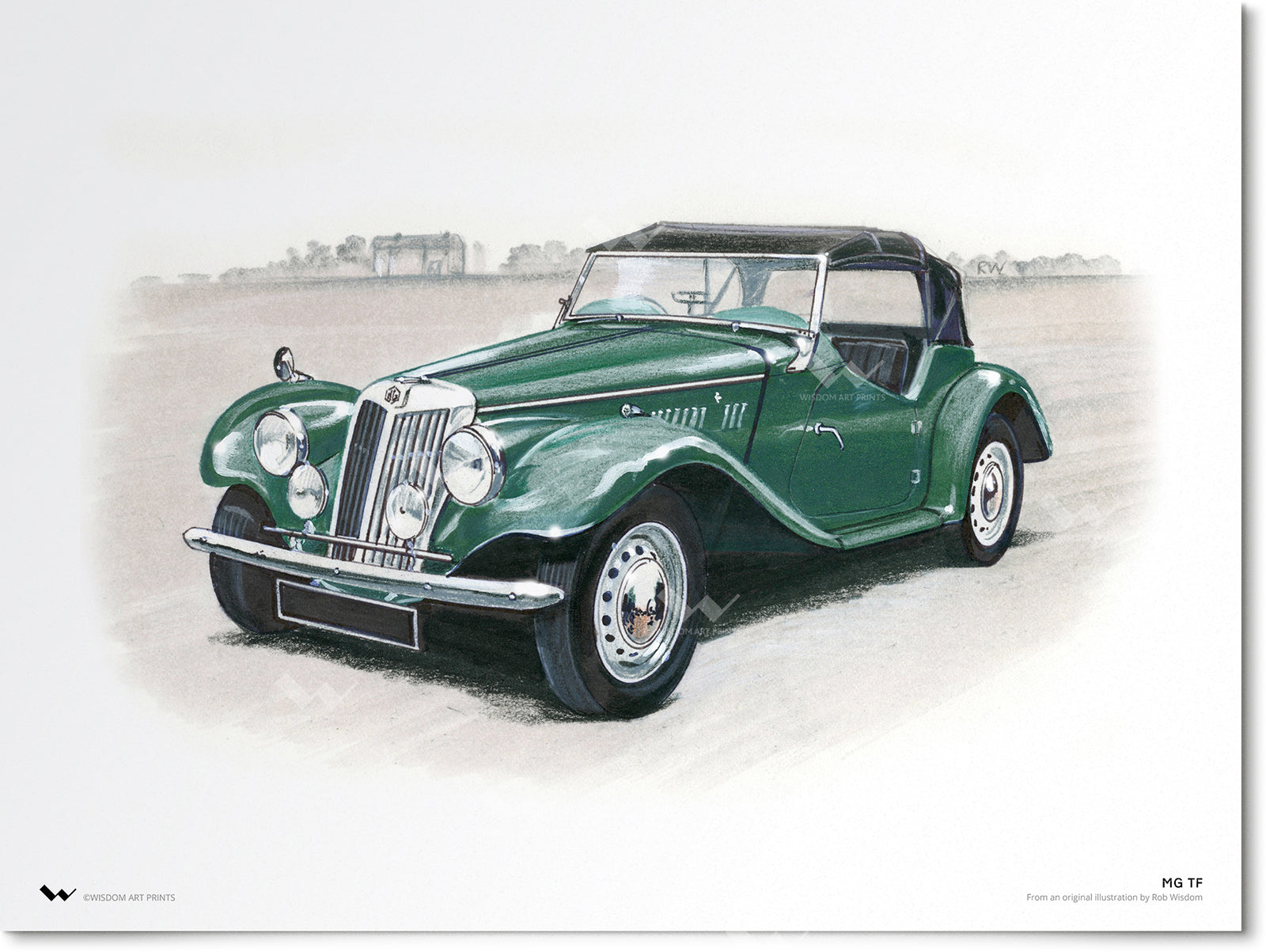 The MG TF, also known as the TF Midget, is a classic sports car that was produced under the MG marque from 1953 to 1955, a facelift of the earlier MG TD. This illustration depicts an MG TF in iconic British racing green.