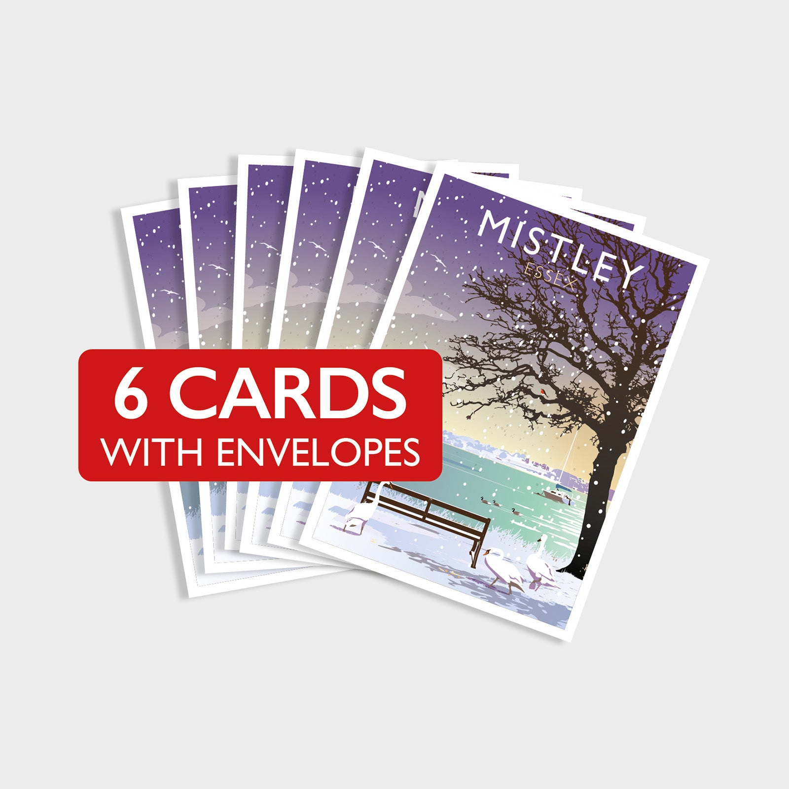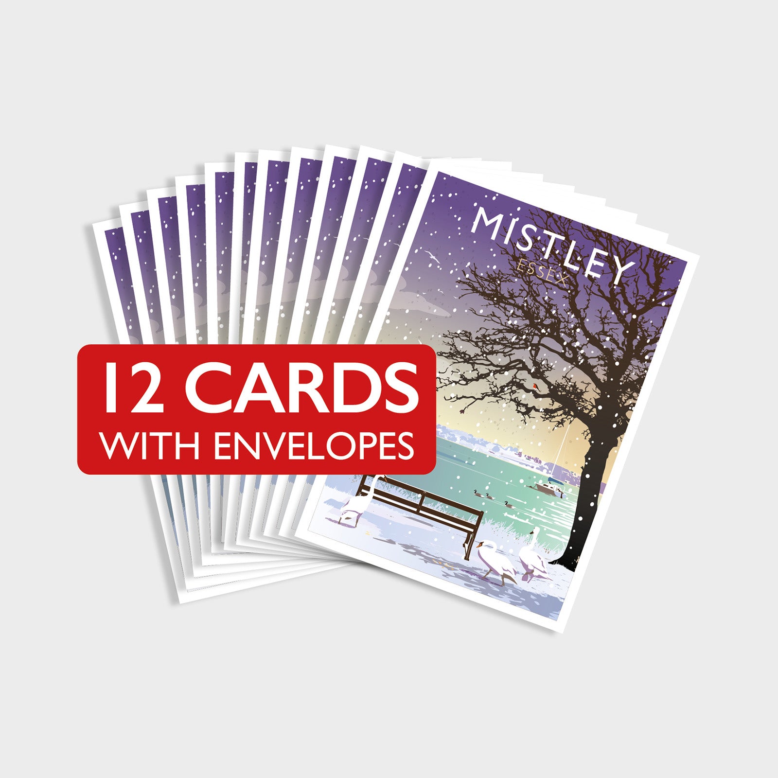 Mistley is on Holbrook Bay, on the south bank of the River Stour that separates Essex from the neighbouring country of Suffolk. It is Mistley's view over the water that is depicted in this illustration, inspired by the view from The Walls. The scene is of a snowy winter's day.