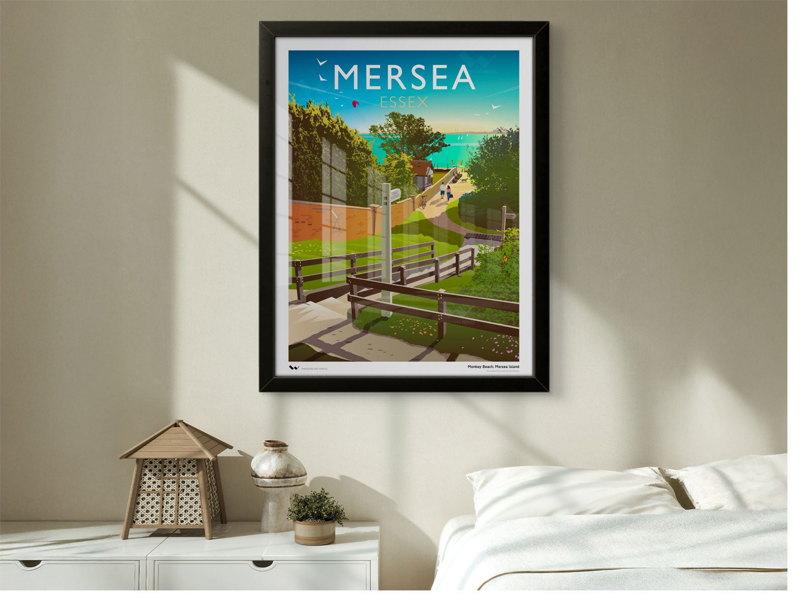Original art print of Monkey Beach on Mersea Island, Essex. This curiously-named beach may owe its name to an old lookout used by the coastguard, who looked to the locals like monkeys in a cage. The true reason may well be lost to time. Wherever its name comes from, Monkey Beach is an isolated little slice of beach, looking out across the water towards Bradwell-on-Sea.