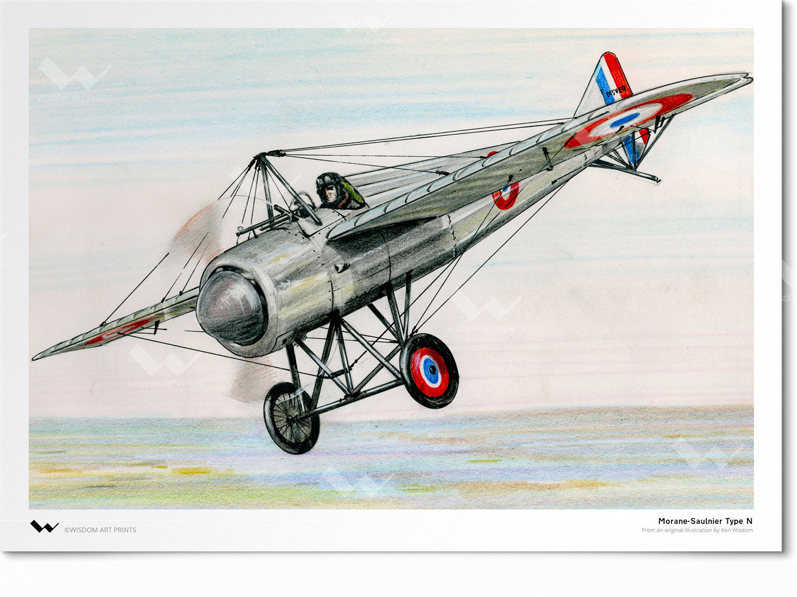 Original illustration of the Morane-Saulnier Type N, a French fighter monoplane used primarily by the Aéronautique Militaire during the First World War. It was also flown by the Royal Flying Corps, who nicknamed it the "Bullet", and by the Imperial Russian Air Force. Introduced in 1915, the Type N was a victim of the rapid pace of military advancement during the war, and soon became outclassed by newer aircraft.