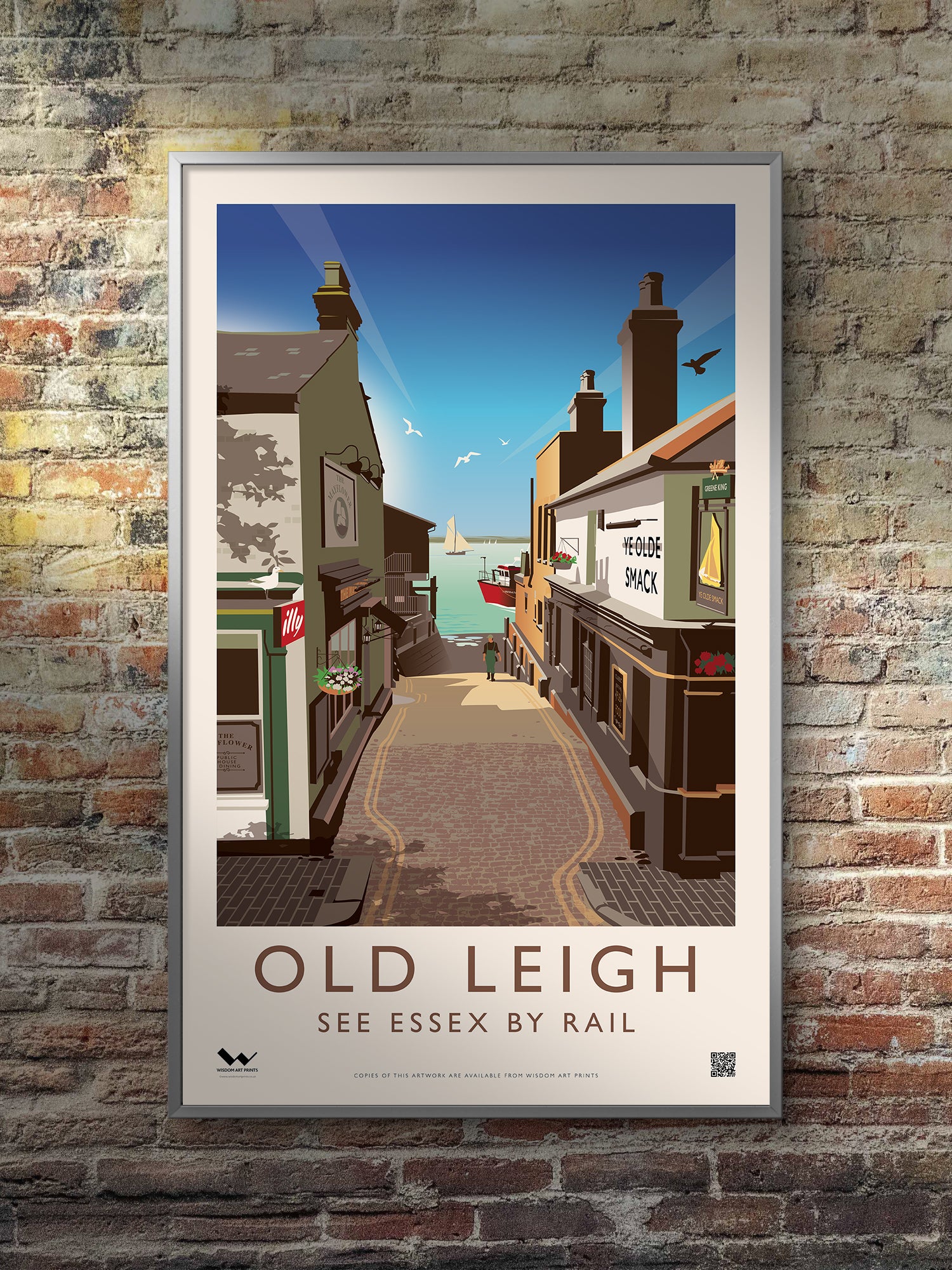 Platform poster of Old Leigh, the traditional seaside area of Leigh-on-Sea in Southend, Essex. Leigh's history stretches back a thousand years as a fishing port, growing into a prospering port on the route to London by the 16th century. With the construction of the London to Southend railway in the 19th century, however, much of Old Leigh was demolished to make way for the tracks. Old Leigh now refers to the town's seafront south of the railway, while the bulk of Leigh-on-Sea sprawls over the hills north of the railway line.
