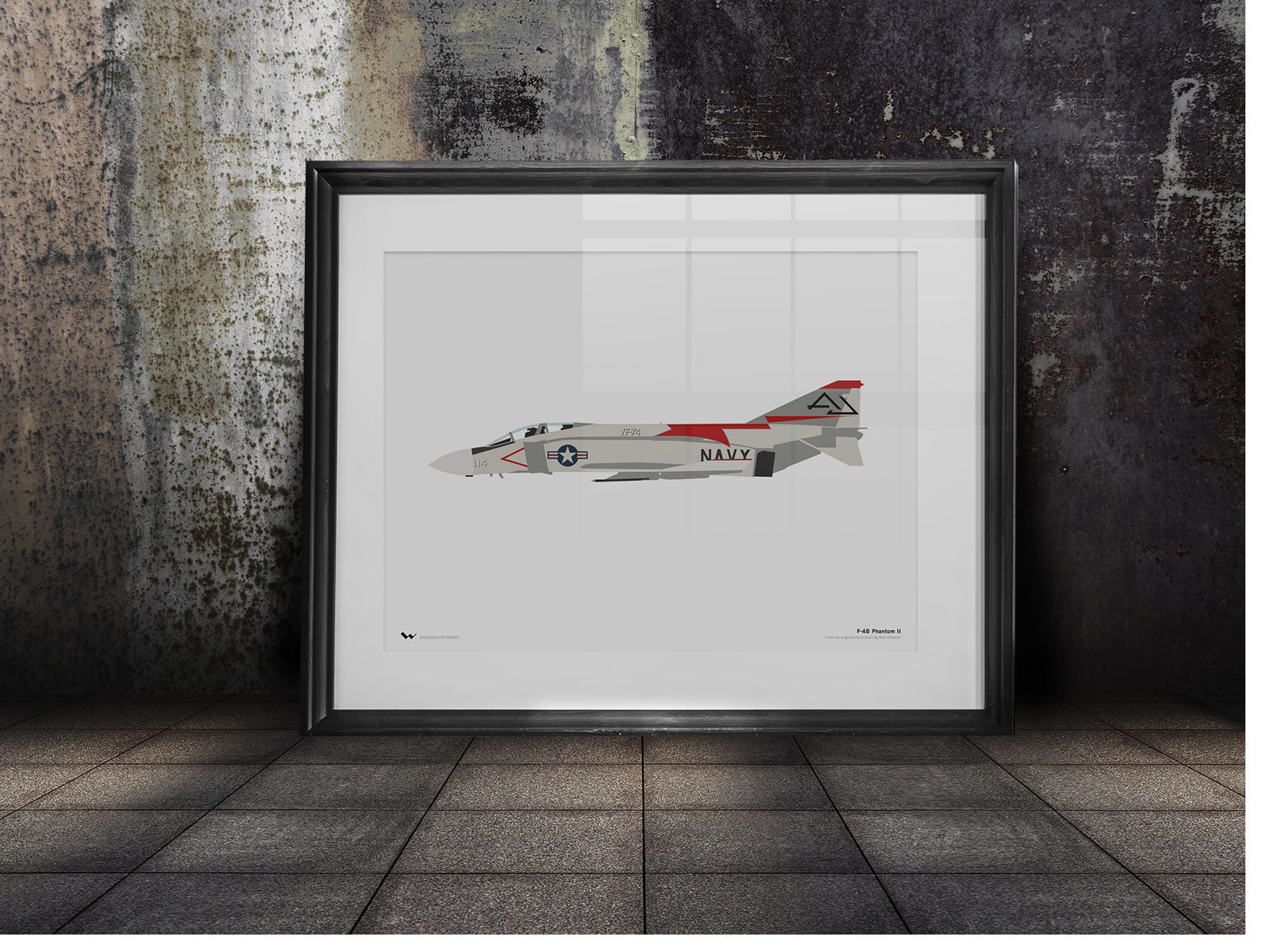 High quality art print of the McDonnell Douglas F-4B Phantom II, an American fighter-bomber jet aircraft. One of the most iconic aircraft of the Cold War, a total of 5,195 Phantom IIs were built, more than any other American supersonic aircraft.