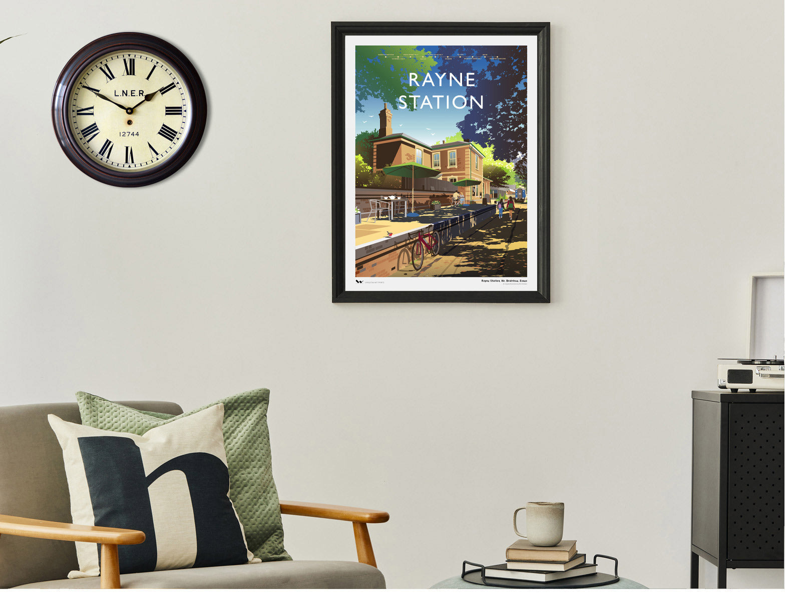 High quality greeting card of Rayne Station, depicted in a style that harkens back to railway posters from the golden age of rail. The station was built in 1866 and was one of a number of smaller stations serving the Bishop's Stortford to Braintree branch line. Buildings consisted of Station Masters house, ticket office, lamp room and toilets as well as a goods yard and shed, coal yard and cattle dock. The main building was restored in 1994 and later converted into a cafe room which became the Booking Hall Cafe in 2009. The Station House which is still used as a home was Grade II listed in 2015. The Carriage Museum provided by the Friends of the Flitch Way can just be seen along the tracks. Walkers and cyclists enjoy the Flitch Way and Rayne station has become a hub of activity, hopefully serving the district of Braintree for a long time to come.