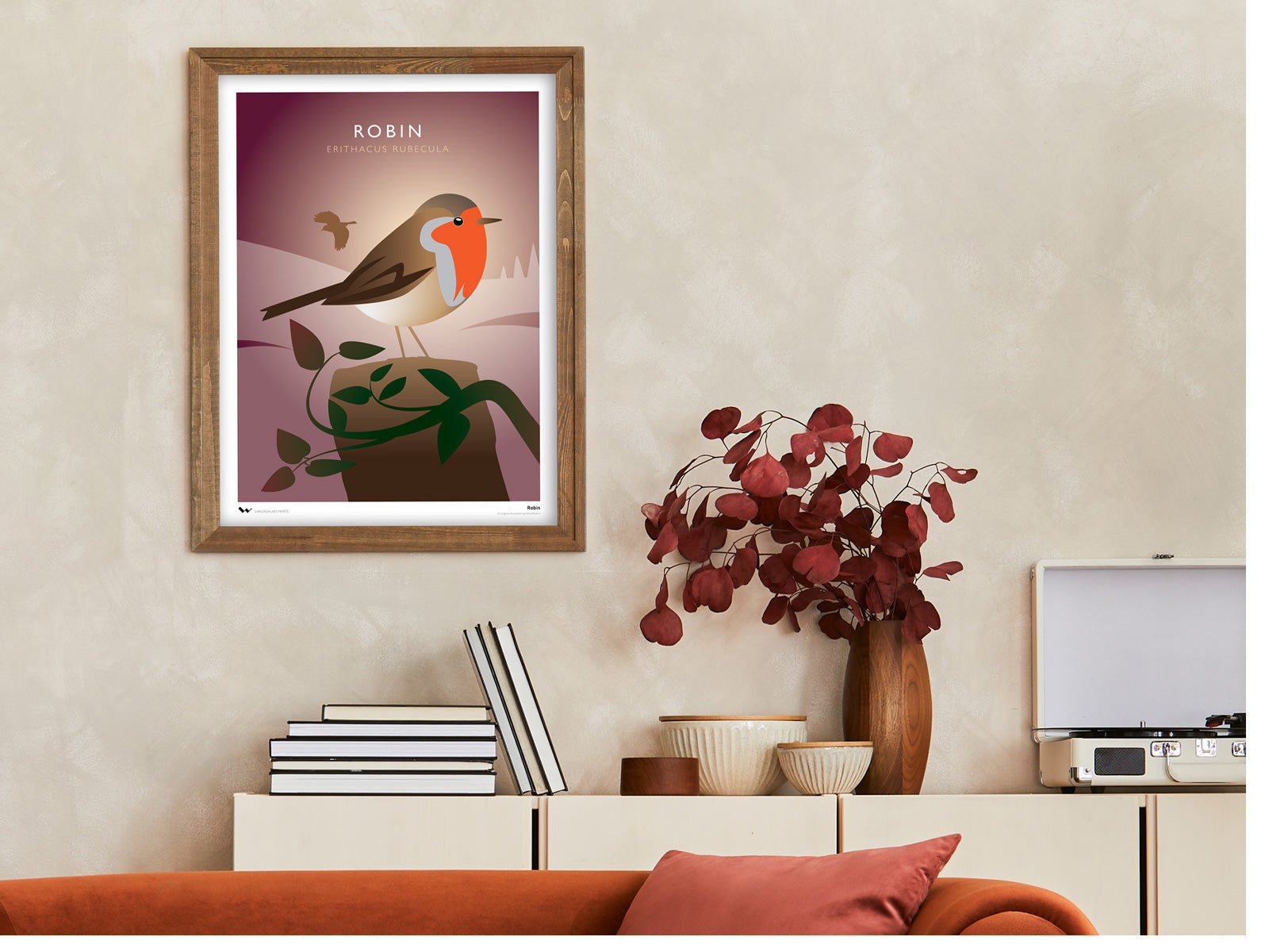 One of a collection of illustrations by Rob Wisdom, depicting Britain's most beloved birds. Arguably the most famous of all of Britain's native birds, the Robin is particularly associated with the festive season - perhaps this is due to the large numbers of Scandinavian Robins that migrate to Britain in the winter? Robins are known for their distinctive plump bodies and red bellies, and are considered by many to be Britain's unofficial national bird.