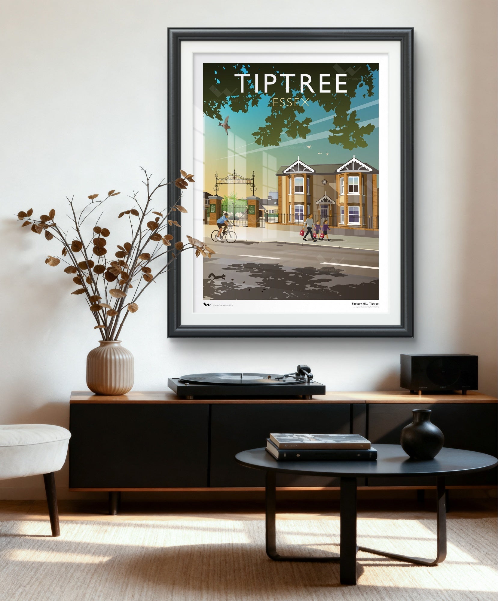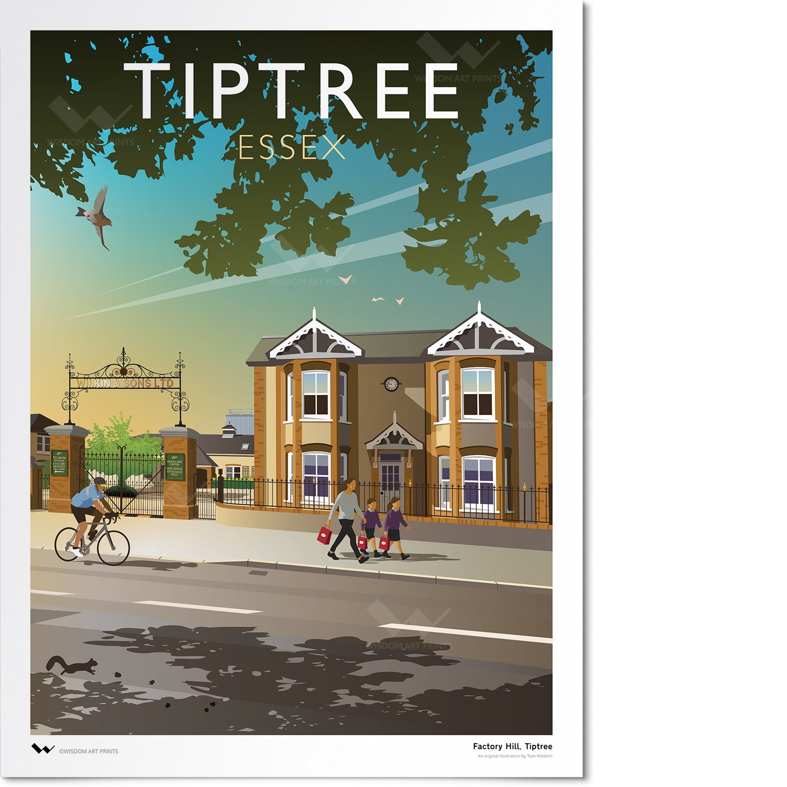 Original art print of Tiptree, Essex, depicting the top of Factory Hill, near the crossroads and the War Memorial. Factory Hill takes its name from the Wilkin and Sons jam factory that has been based in the village for well over a century, and this view shows beyond the formal entrance and recently-restored iconic factory gates.
