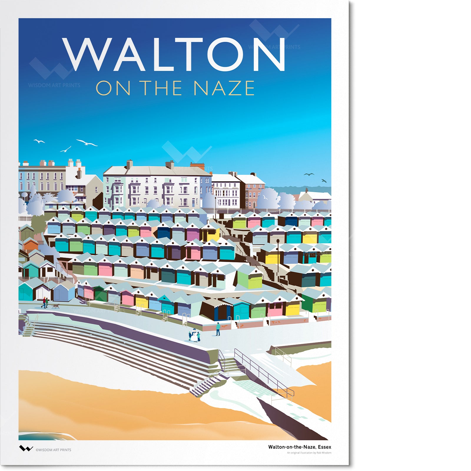 High quality Christmas art print of Walton-on-the-Naze, a coastal town in Tendring, Essex, bordering Frinton-on-Sea. A popular seaside destination, Walton is home to Walton pier, the third-longest pier in the country, as well as to miles of sandy beaches. The town's beach huts are hugely popular, and play a starring role in this original illustration.