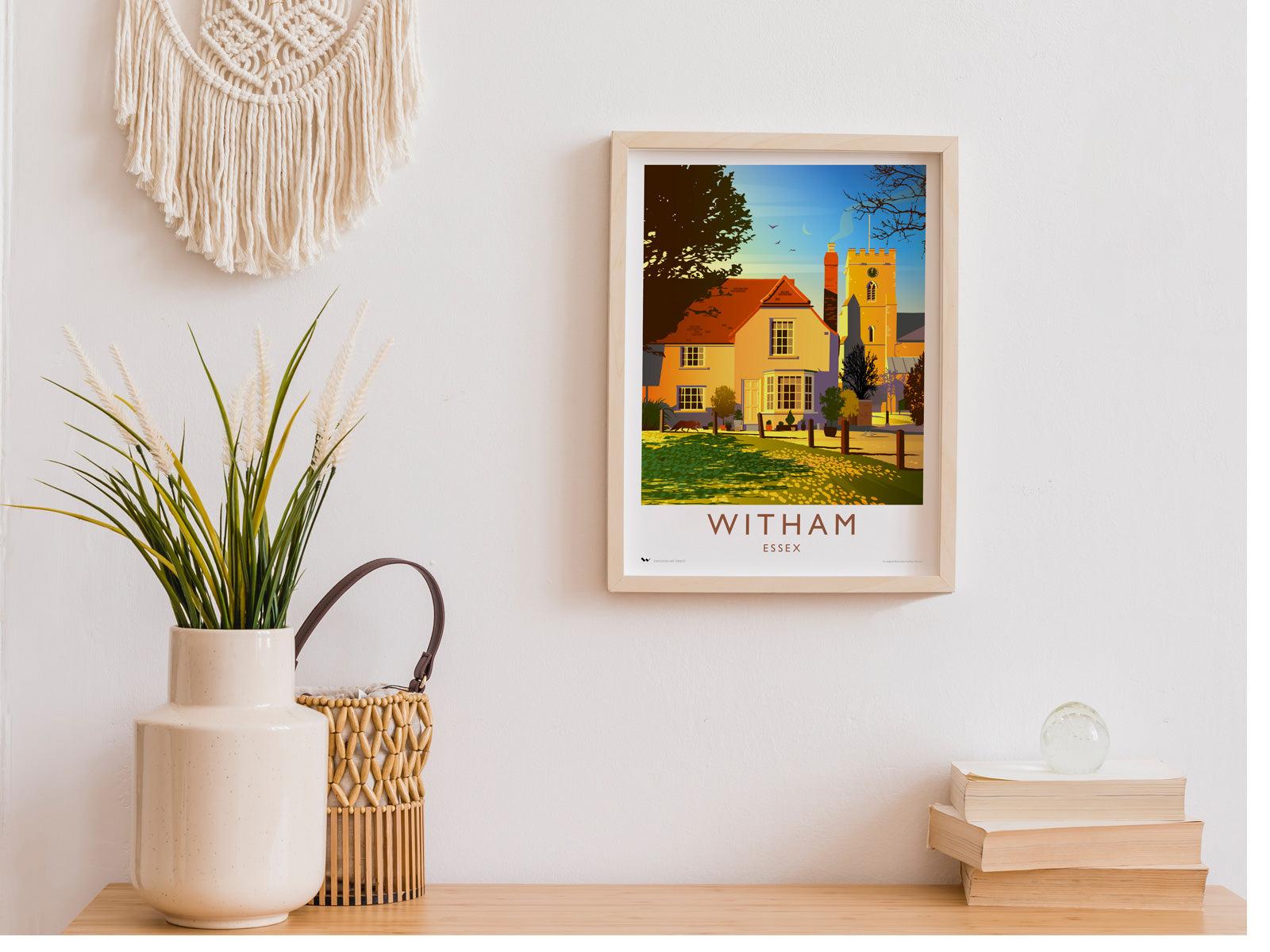 This Essex illustration by artist Rob Wisdom is a high-quality Giclée travel poster. For our classic art print of Witham, please click here.